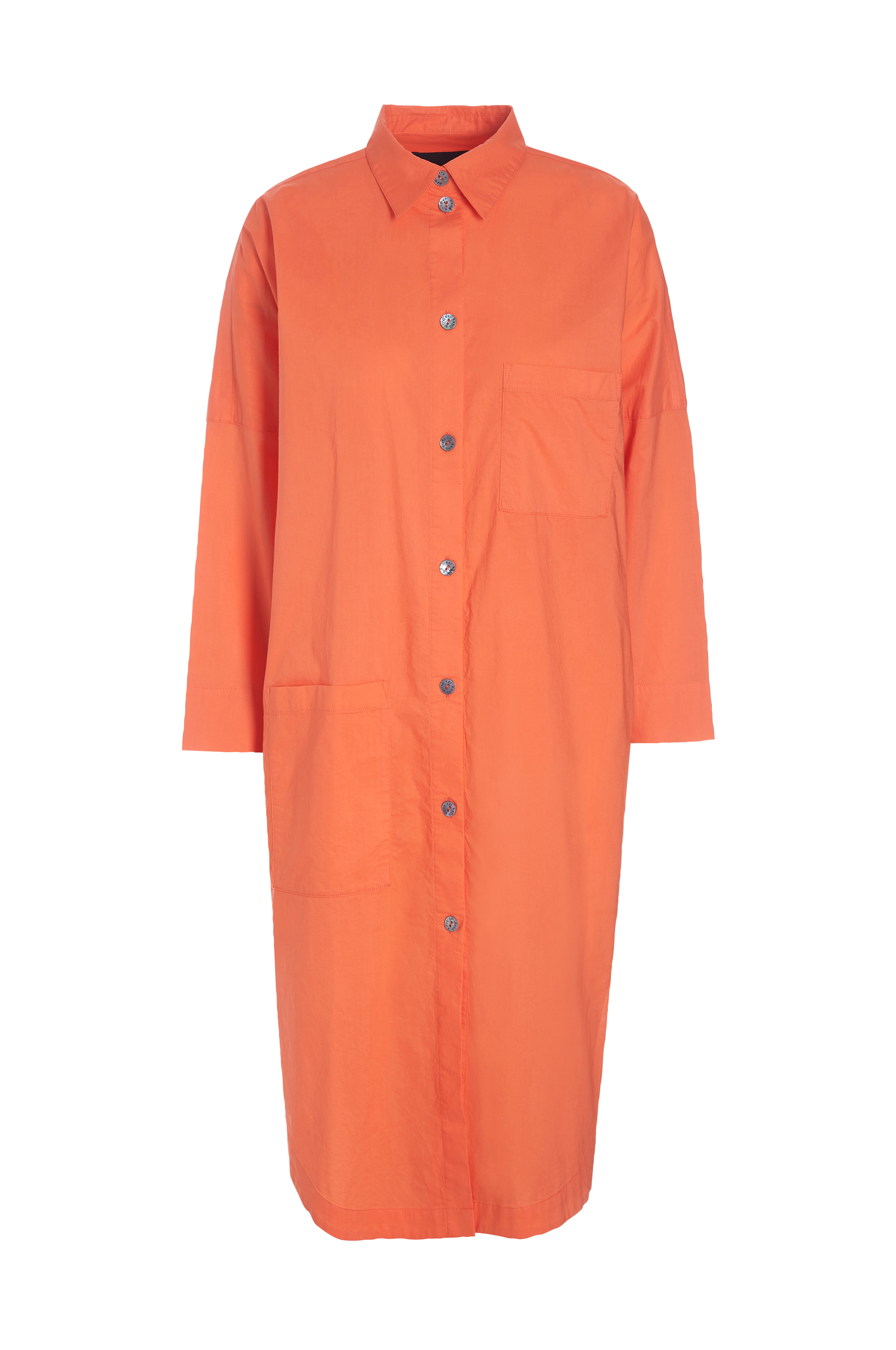 • Skjortklänning i bomull • Knäppning i full längd med knappar i pärlemorlook • Ärmar i 3/4-längd med slitsar i ärmsluten • Skjortkrage • Stora, asymmetriskt placerade fickor • Slitsar nedtill i sidorna • Rundat framstycke • Längre baktill • Längd ca 109 cm i stl 34/38