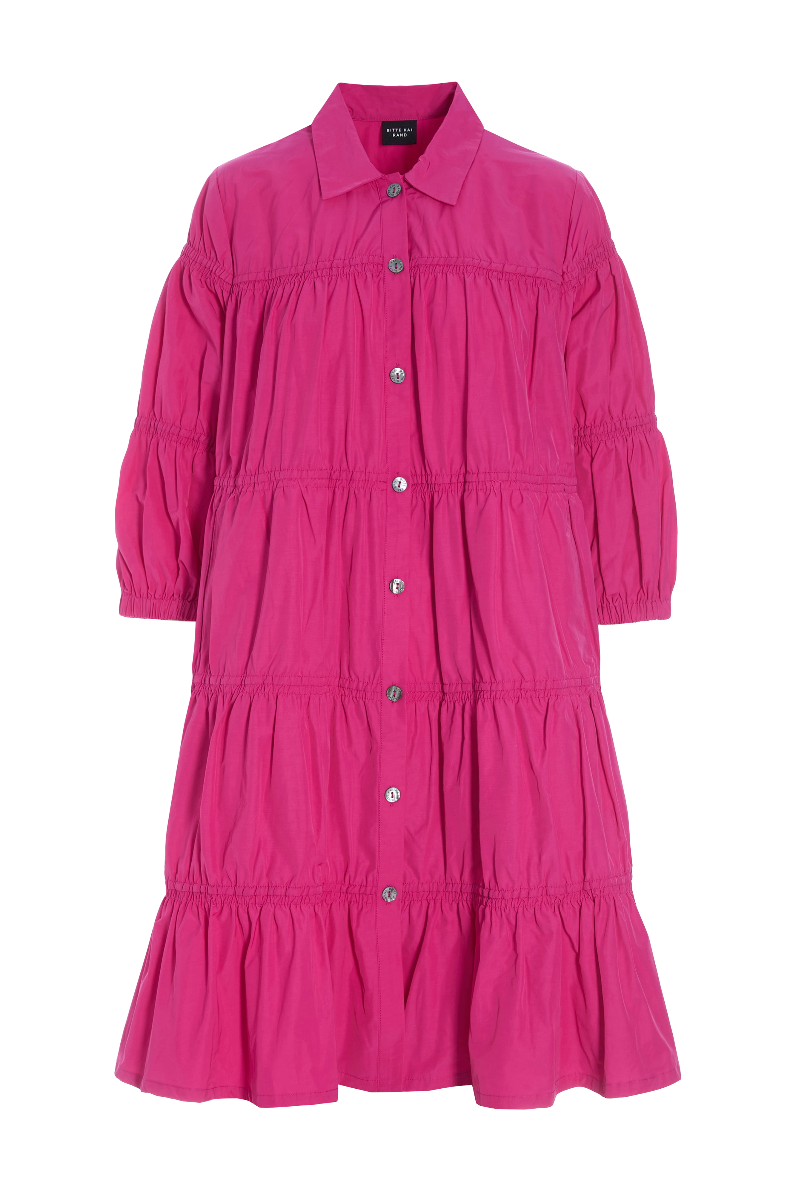 • A-linjeform med vidd• Knappar fram• Rynkning över hela• 3/4-långa ärmar• Längd: 90 cm i storlek S