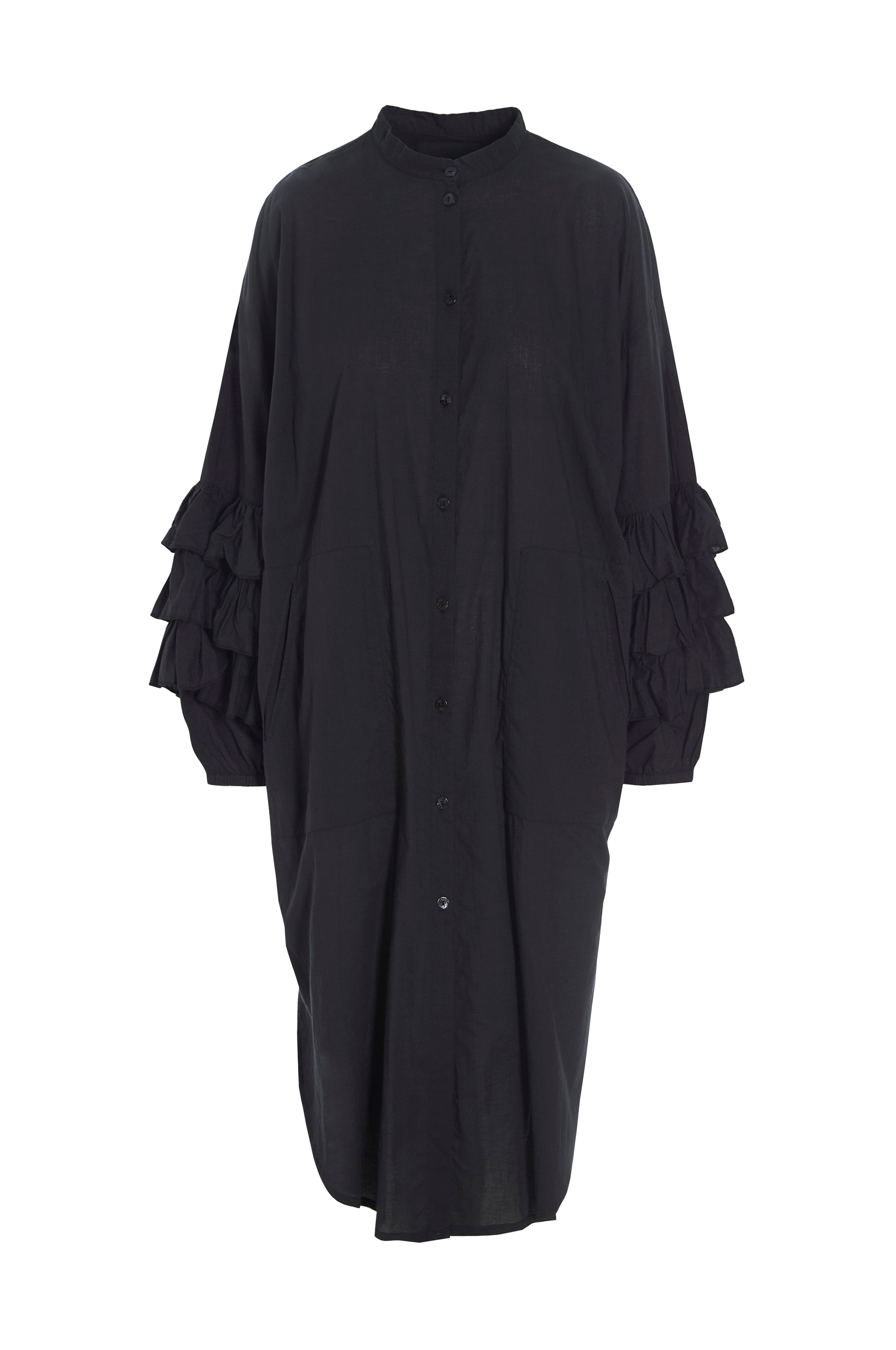 • Rund halsringning• Knappar hela vägen fram• Stora framfickor• Långa ärmar med volanger nedtill och resår i ärmsluten• Rundad nederkant• Längd: 119 cm i storlek S