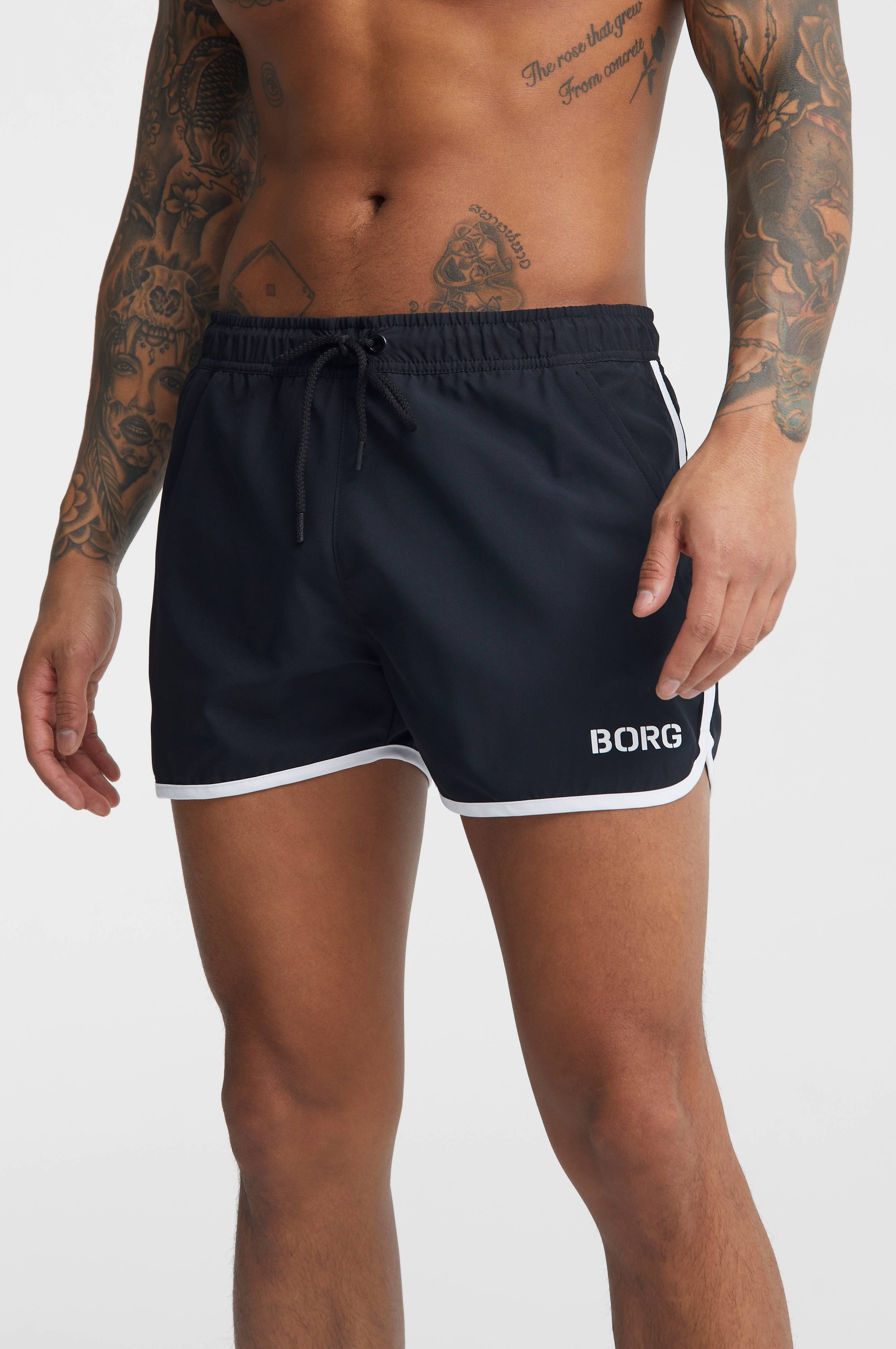 Badshorts från Björn Borg med två sidofickor och en bakficka. Midjan har en justerbar dragsko runtom och innerbyxan är i ett meshtyg.