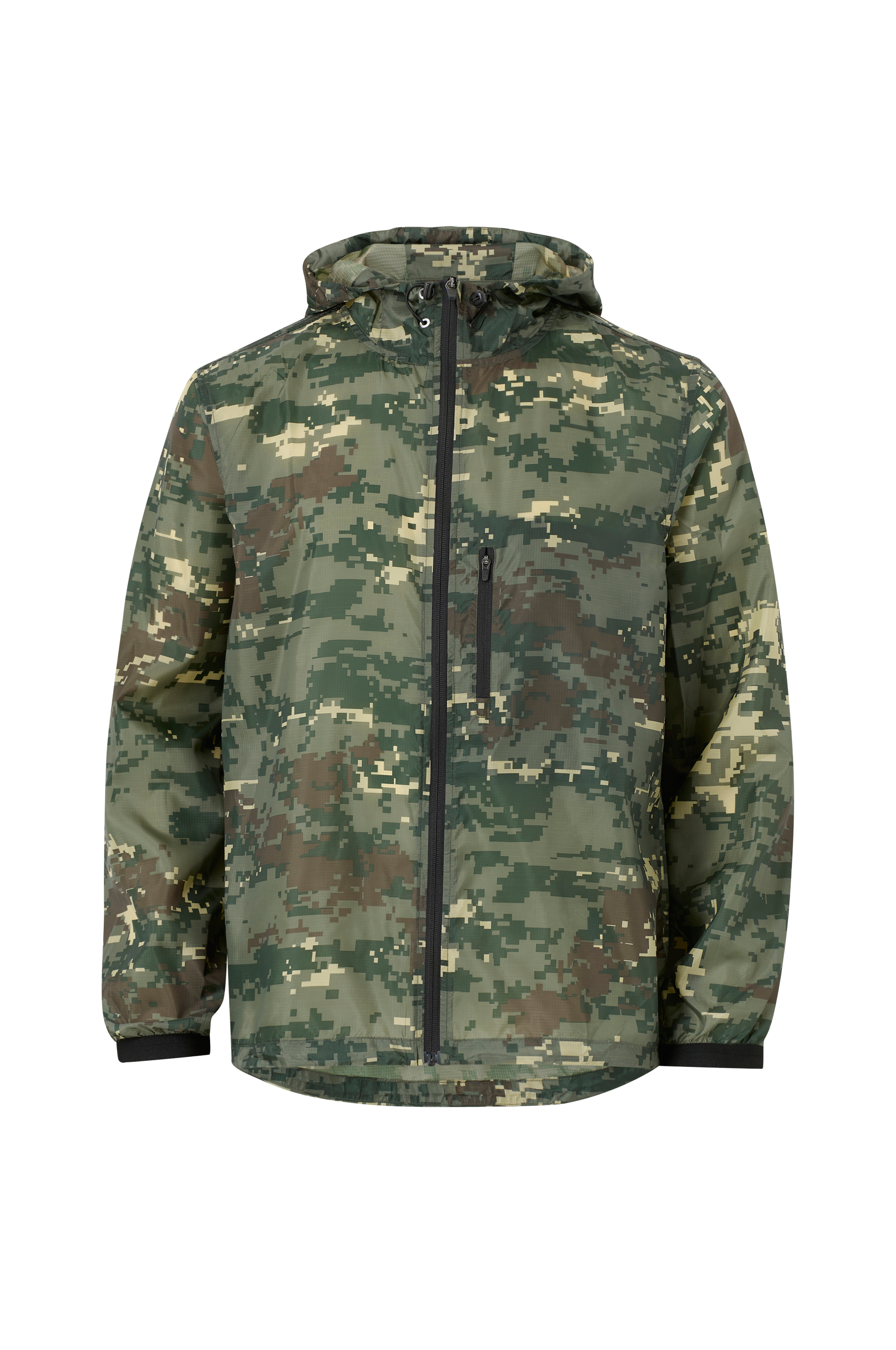 Vindjacka / träningsjacka i lätt kvalitet med huva. Öppning på ryggen med ventilerande mesh bakom. Bröstficka med dragkedja. Dragsko med stopper i midja och huva för en säker och skön passform. Resår i ärmsluten. Tillverkad av ripstop väv i 100% polyester.