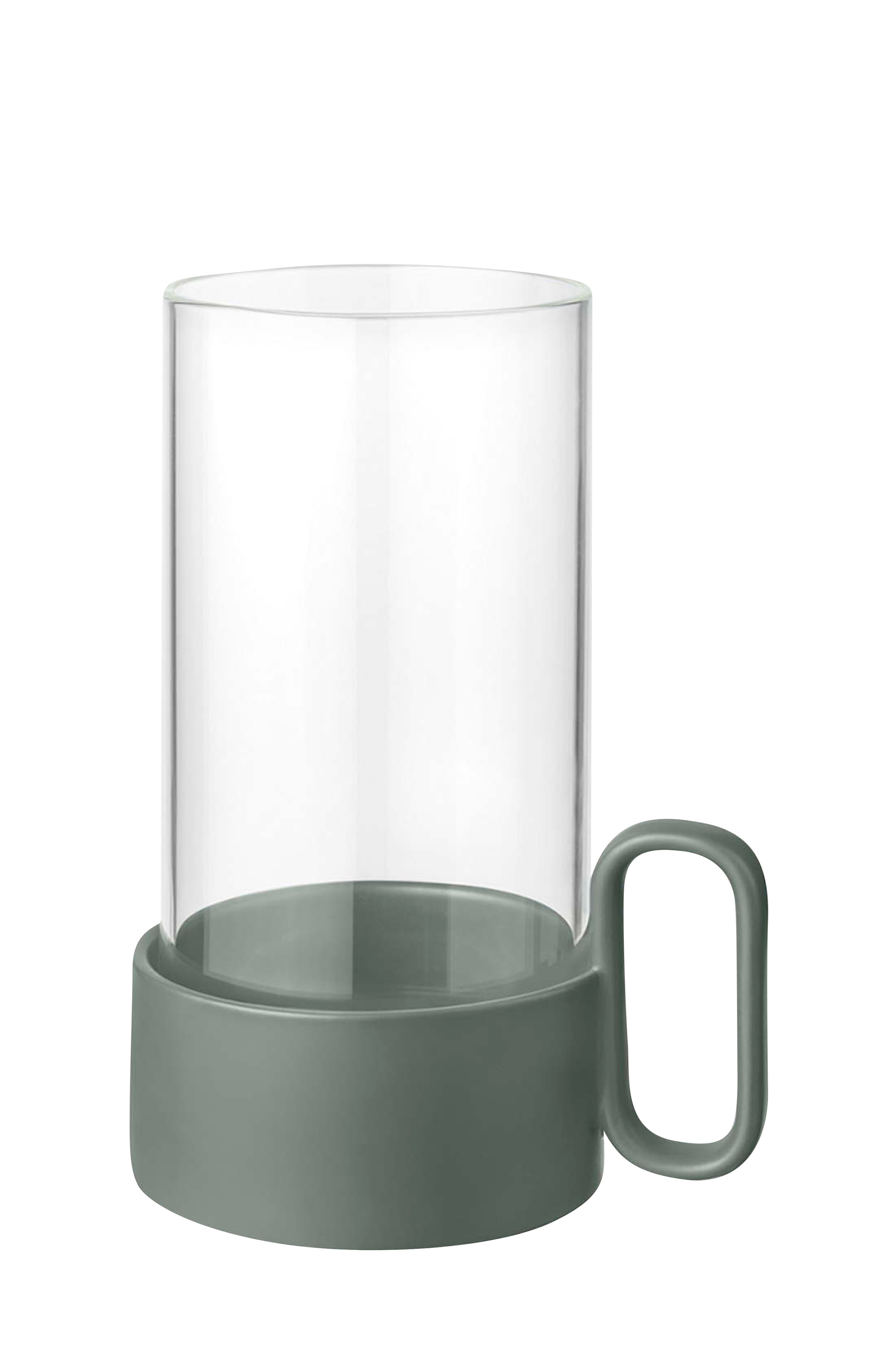 Den består av en bärbar keramisk bas och en glascylinder som skyddar det brinnande ljuset. Tack vare handtaget är lampan lätt att transportera.