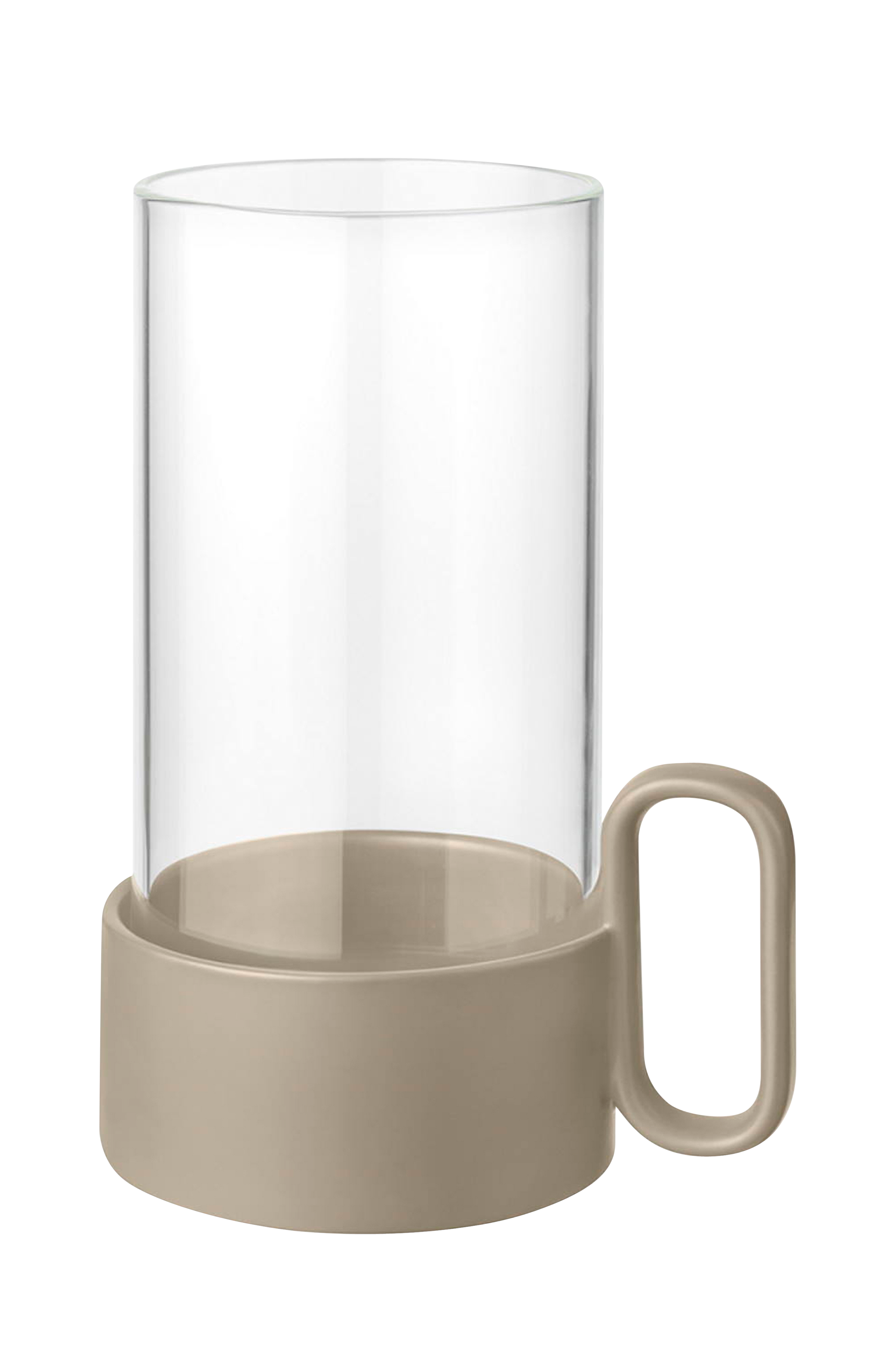 Den består av en bärbar keramisk bas och en glascylinder som skyddar det brinnande ljuset. Tack vare handtaget är lampan lätt att transportera.