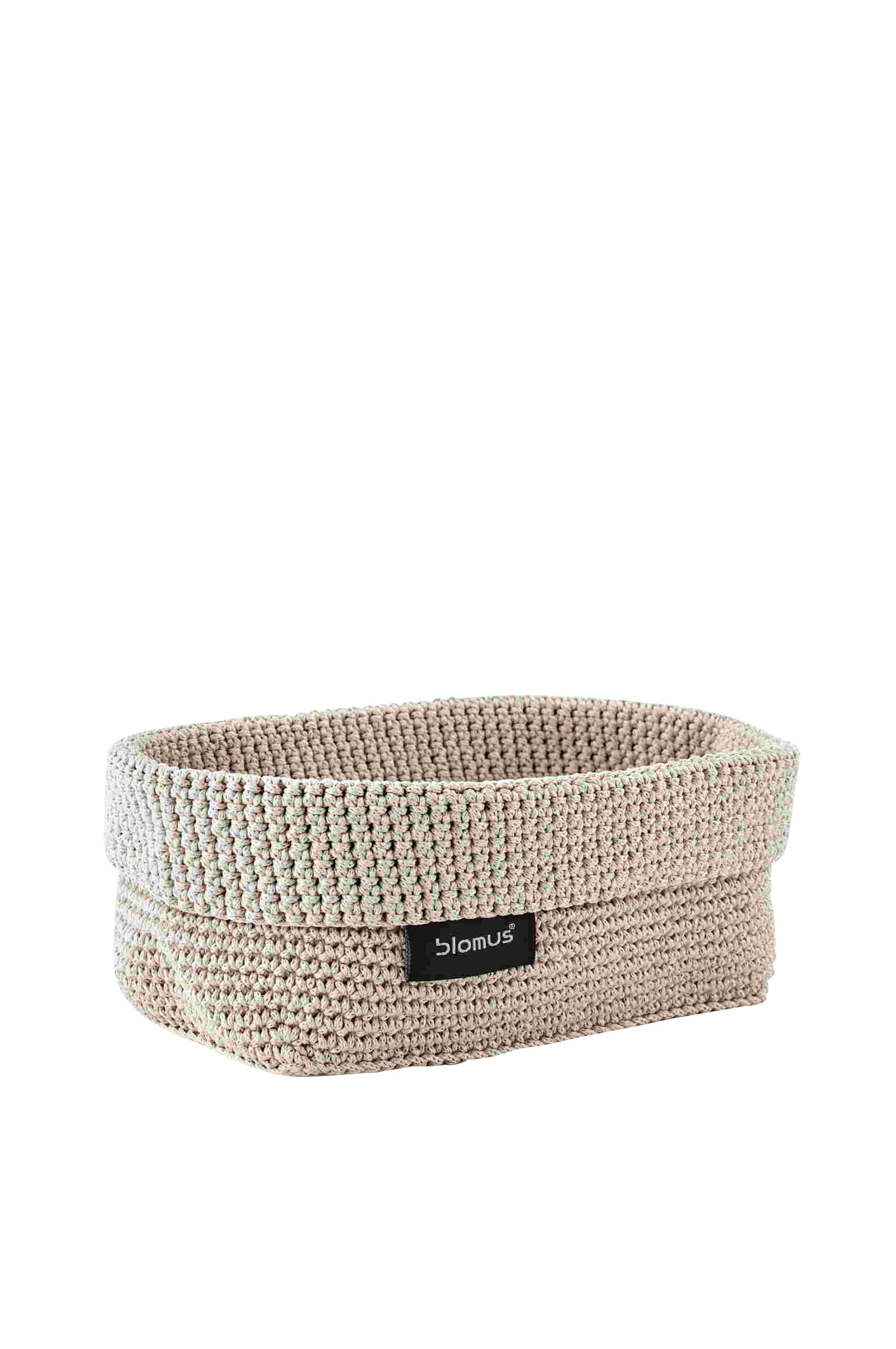 Vacker korg i virkad textil. Praktisk förvaring på badrummet för alla småsaker som makeup, pads eller tops. Kan också användas som brödkorg eller förvaring på kontor eller barnrum.Mått: H 9 cm, B 12 cm, L 20 cm