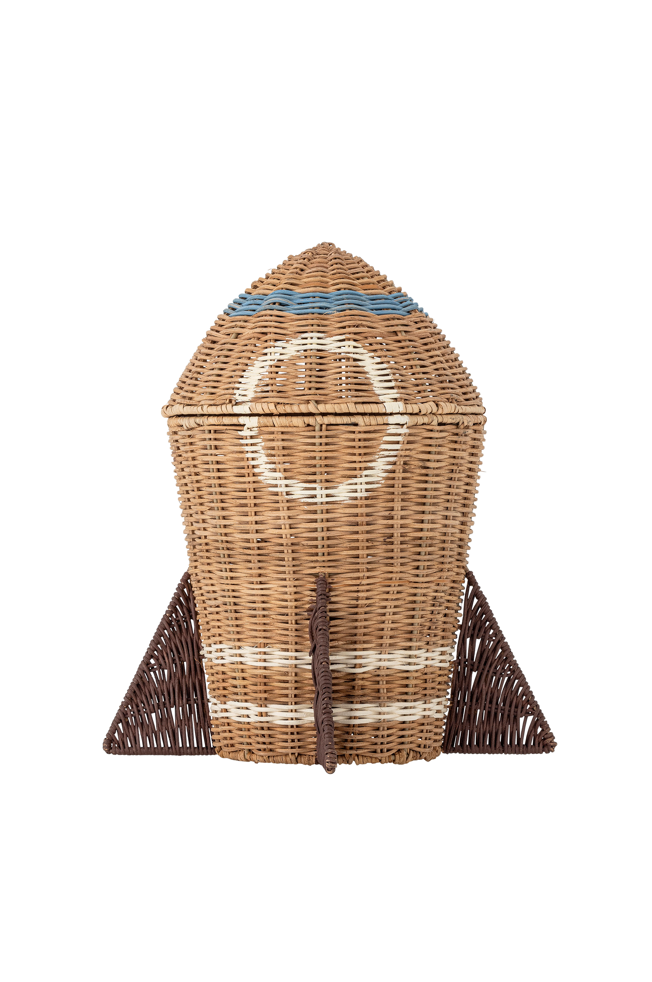 Rymdkorg med lock från bloomingville mini är handvävd i rotting och formad som en raket med charmiga detaljer. Den är både dekorativ och praktisk och passar perfekt för förvaring av leksaker i barnrummet.