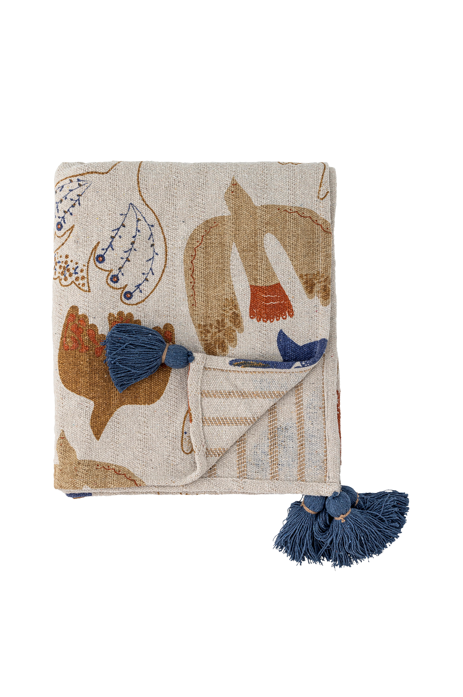 Pläden anniversary från bloomingville är vävd i återvunnen bomull och har ett grafiskt tryck. Tofsarna i hörnen ger en lekfull kontrast och fulländar den dekorativa looken.
