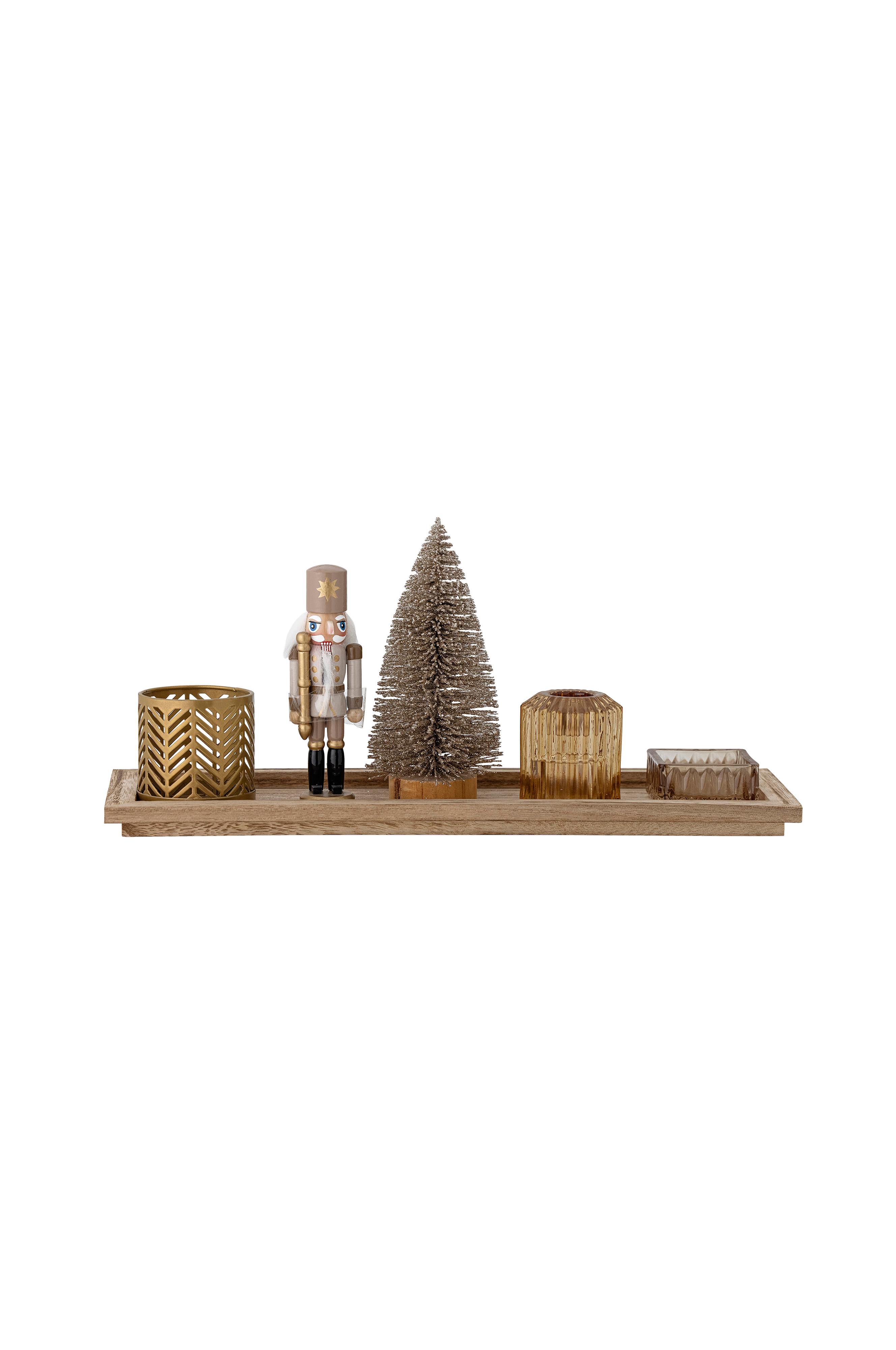 Sanga bricka med ljuslyktor från Bloomingville är en vacker och elegant dekoration. Brickan har tre ljuslyktor av glas, en julgran och en liten nötknäppare som du kan använda som dekoration eller för att skapa en mysig atmosfär. L36xH16xB12 cm, 6-pack