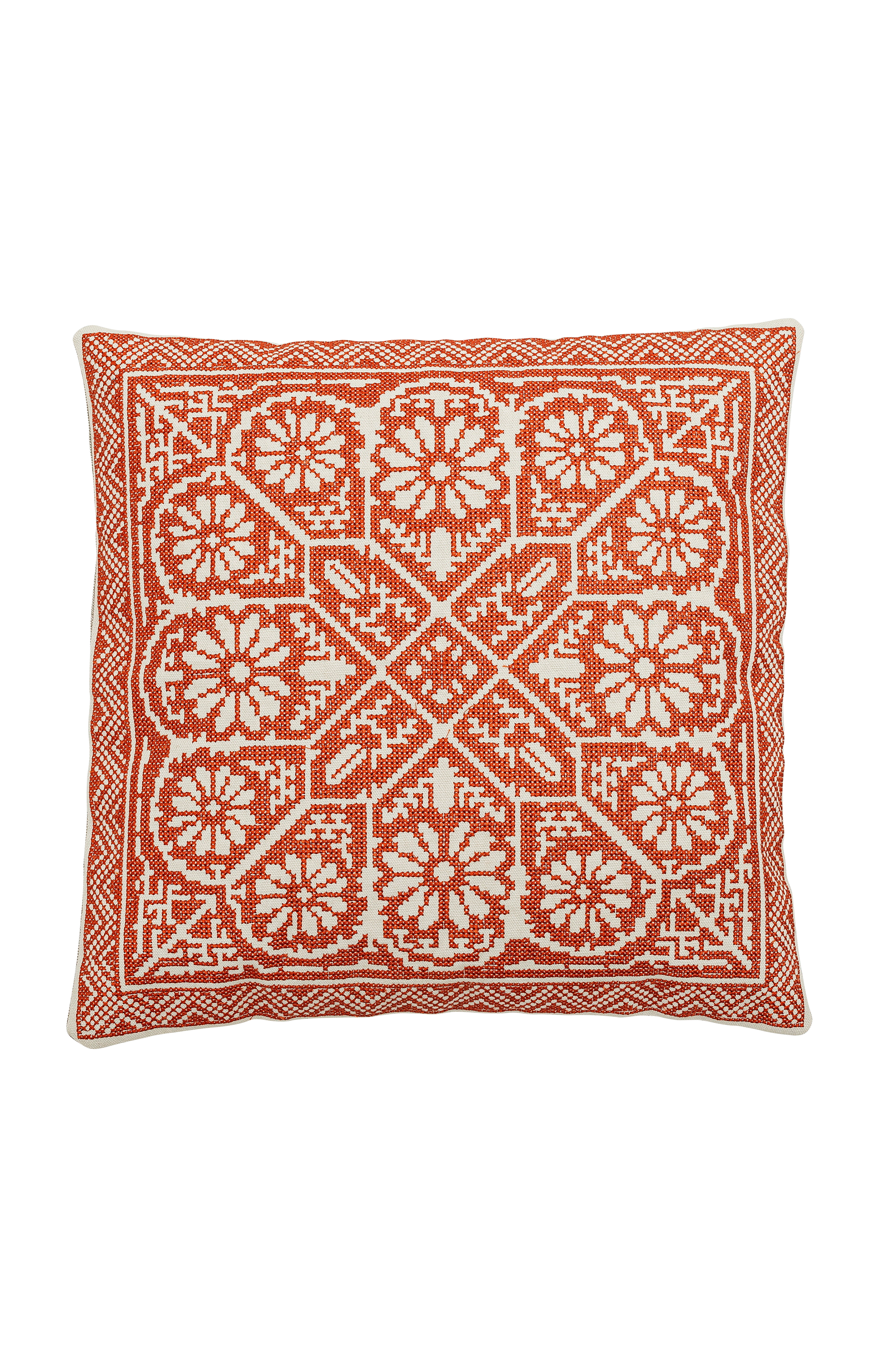 Kudden madita från bloomingville har ett traditionellt mönster i varma röda och naturvita färger. Kudden är designad med symmetriska mönster och detaljerade blommotiv. Den tydliga färgkontrasten och det intrikata mönstret gör kudden till ett slående element i vardagsrummet eller sovrummet, perfekt för att ge textur och en känsla av värme till ditt utrymme. Mått: l40xw40 cm