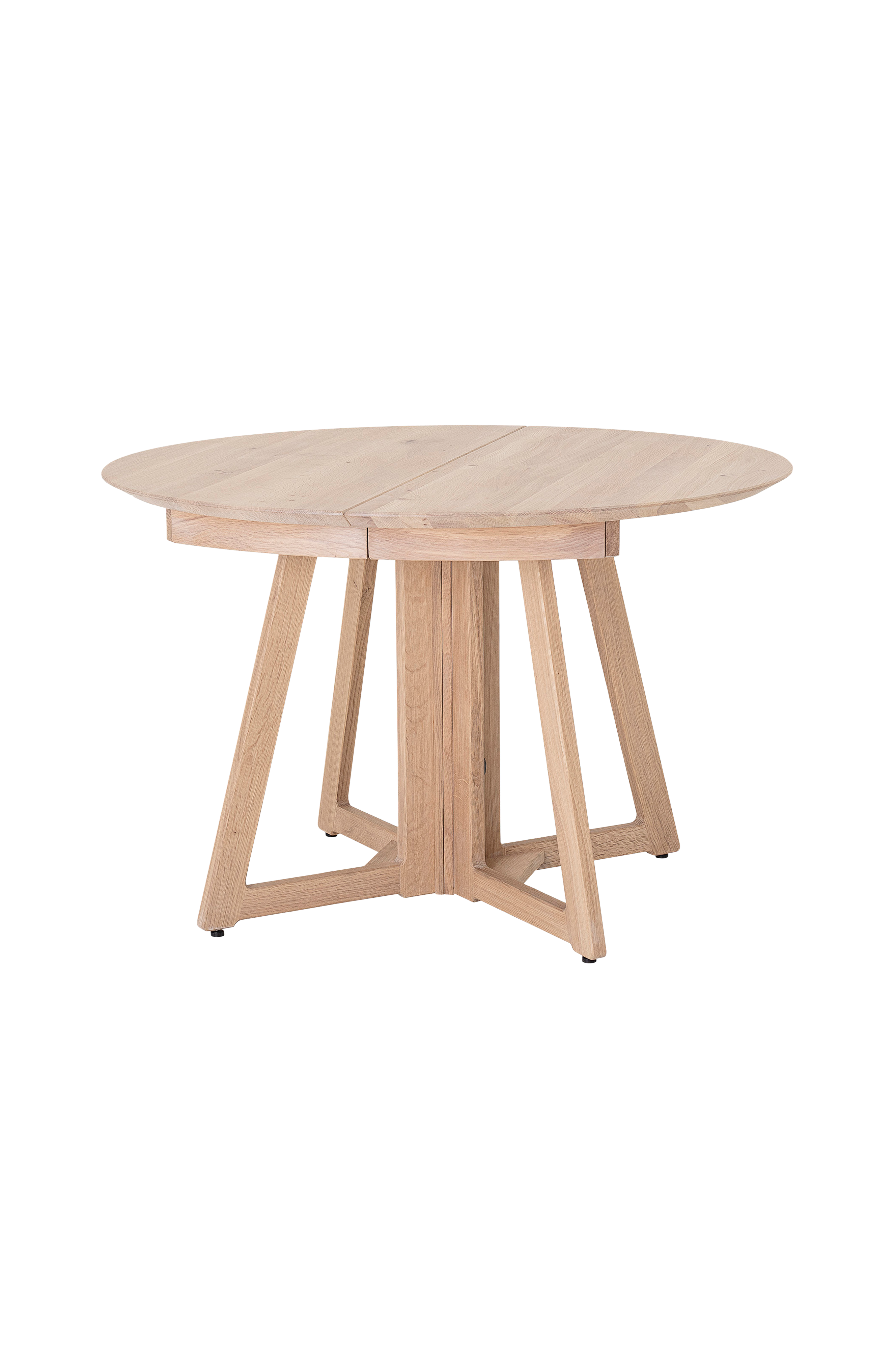 Matbord av massiv ek. Två iläggsskivor ingår. Diameter med 1 iläggsskiva 168 cm. Diameter med 2 iläggsskivor 218 cm. Levereras omonterad.