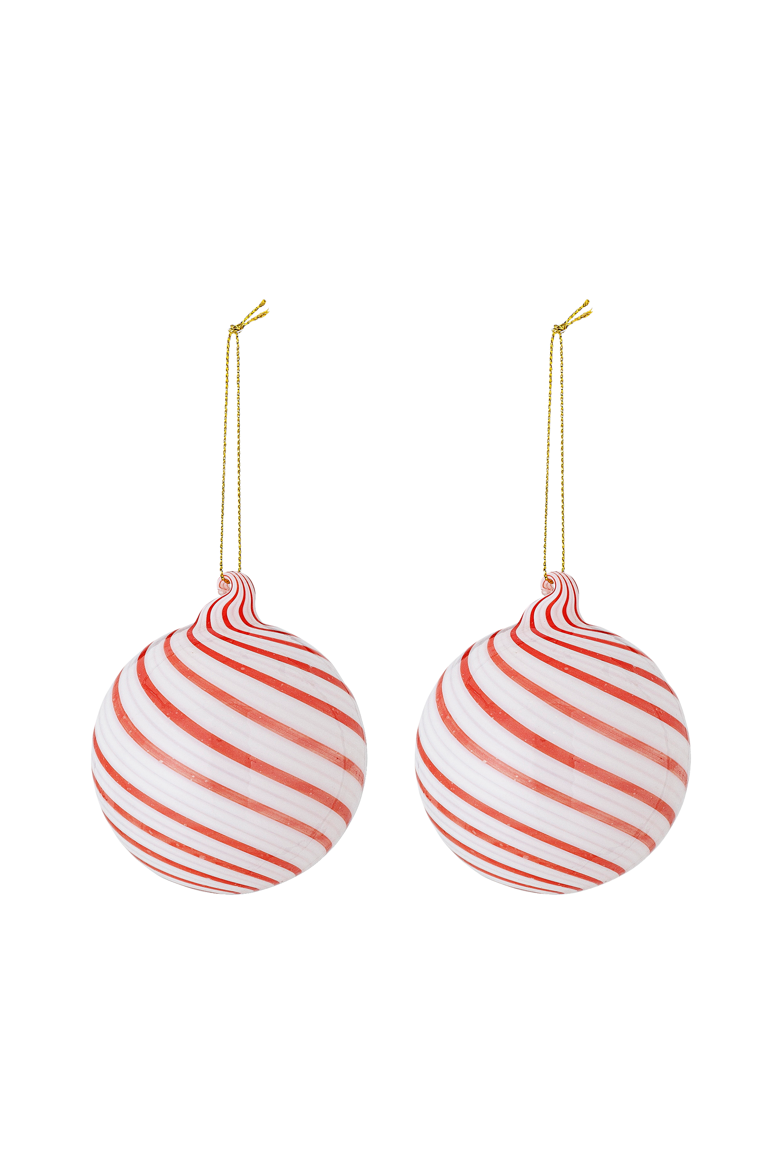 Zwirl Ornament från Bloomingville består av två eleganta glaskulor med en virveleffekt i vita och röda färger, som påminner om klassiska godisbitar. Varje prydnad är munblåst och unik. En fin guldsnodd för upphängning fulländar den eleganta looken.