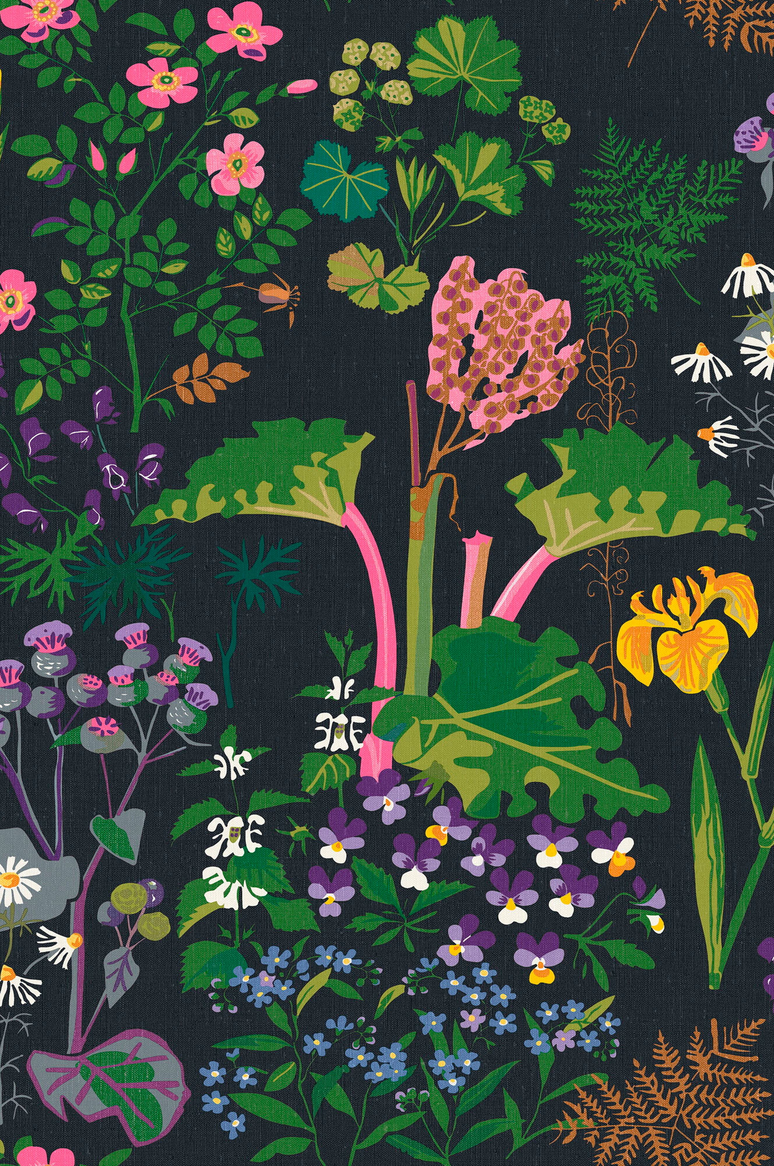 Design av gocken jobs. Gocken jobs skapade en hel rad av växtmönster som fortfarande är välkända och hett efterfrågade. Detta underbart frodiga mönster där rabarber samsas med bland annat daggkåpa, viol och stormhatt, är en av hennes mest älskade. Varje rulle är 10,05 m. Bredd 53 cm. Mönsterpassning 76 cm med förskjuten passning. Trycks i Sverige på ett non-woven material. Tapeten är easyup-märkt, vilket innebär att du applicerar limmet direkt på väggen och du behöver inte grundmåla före.