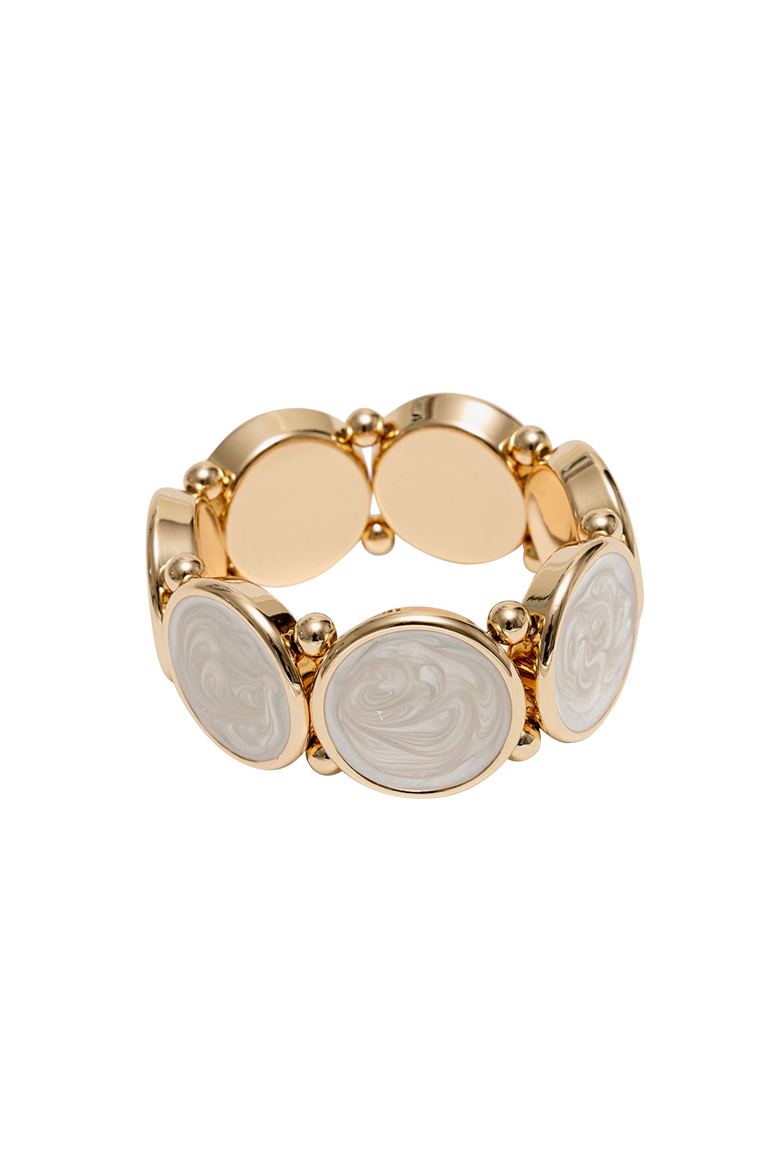 • Elastiskt armband• Pärlemorskimrande cirklar runt hela• Dekorativa pärlor