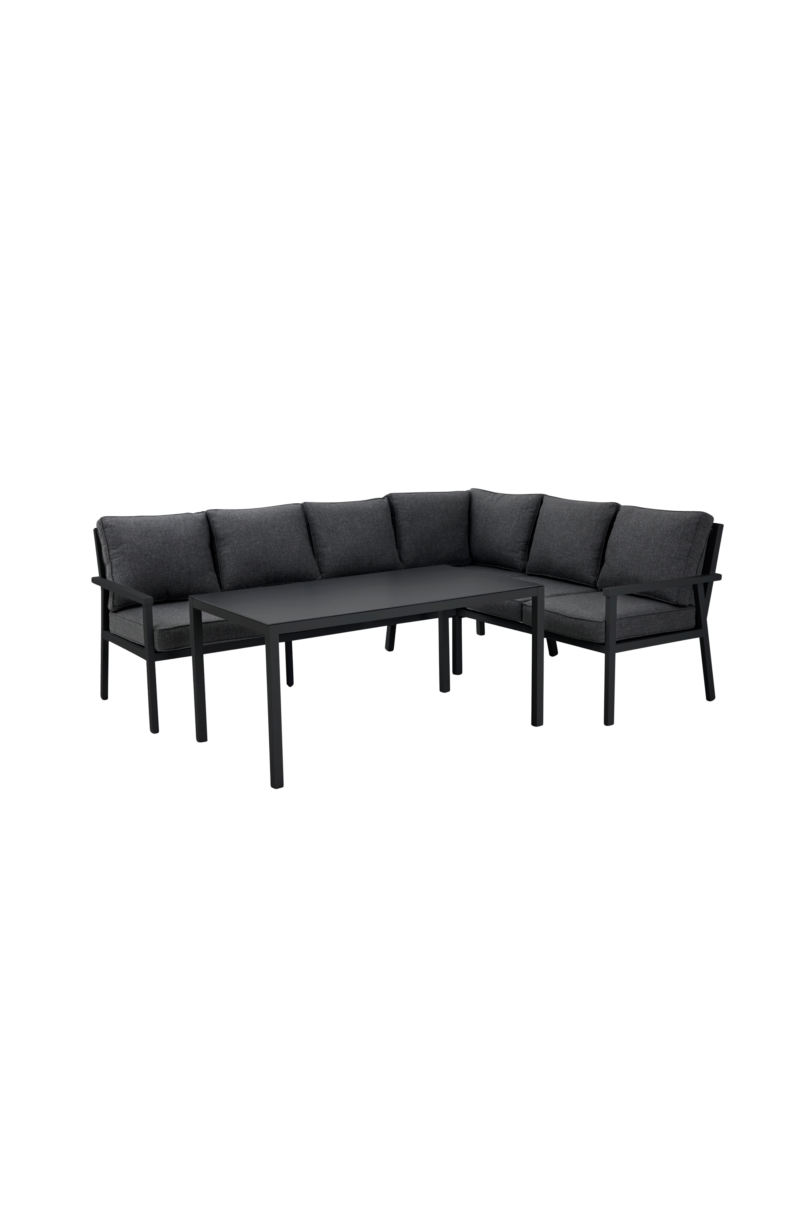 Rana är en soffgrupp i matbordshöjd som är formgiven i en modern och avslappnad anda och med en bekvämlighet som består. Stomme i aluminium och med dynor i olefintyg. Bordsskiva i sprutlackerat glas. Gruppen består utav höger svängd hörnsoffa 252 x 195 cm Höjd 92 cm, djup 78 cm. Soffbord 77 x 137, Höjd 50 cm. Levereras omonterad.