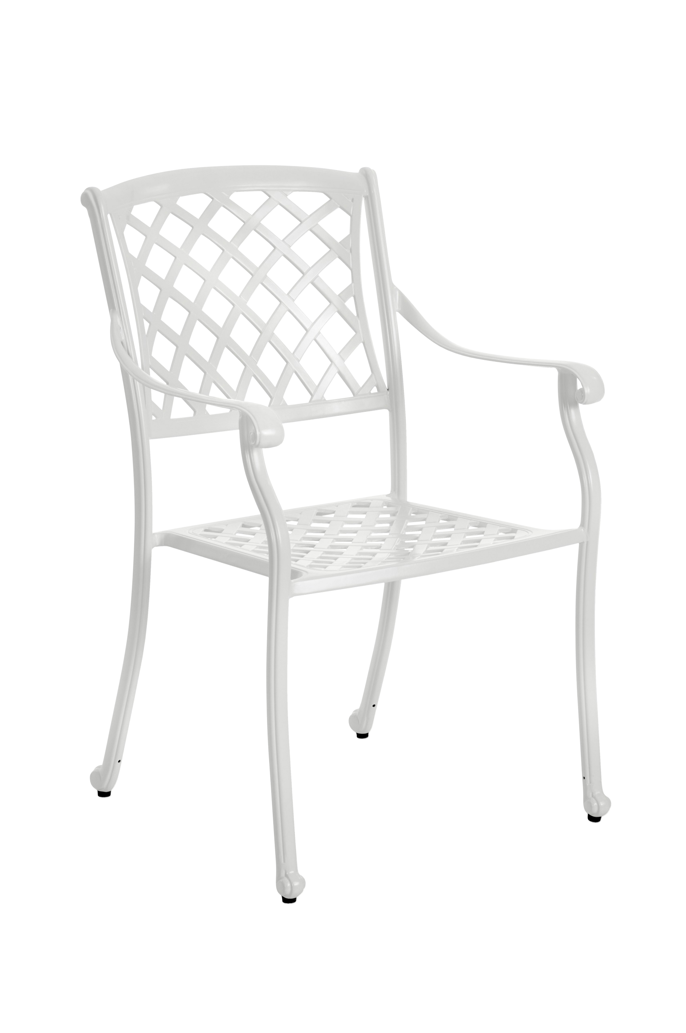 Tidlöst karmstol i gjuten aluminium som inte rostar. Höjd 91 cm, bredd 91 cm, djup 62 cm. Sitthöjd 44 cm. Enklare montering.