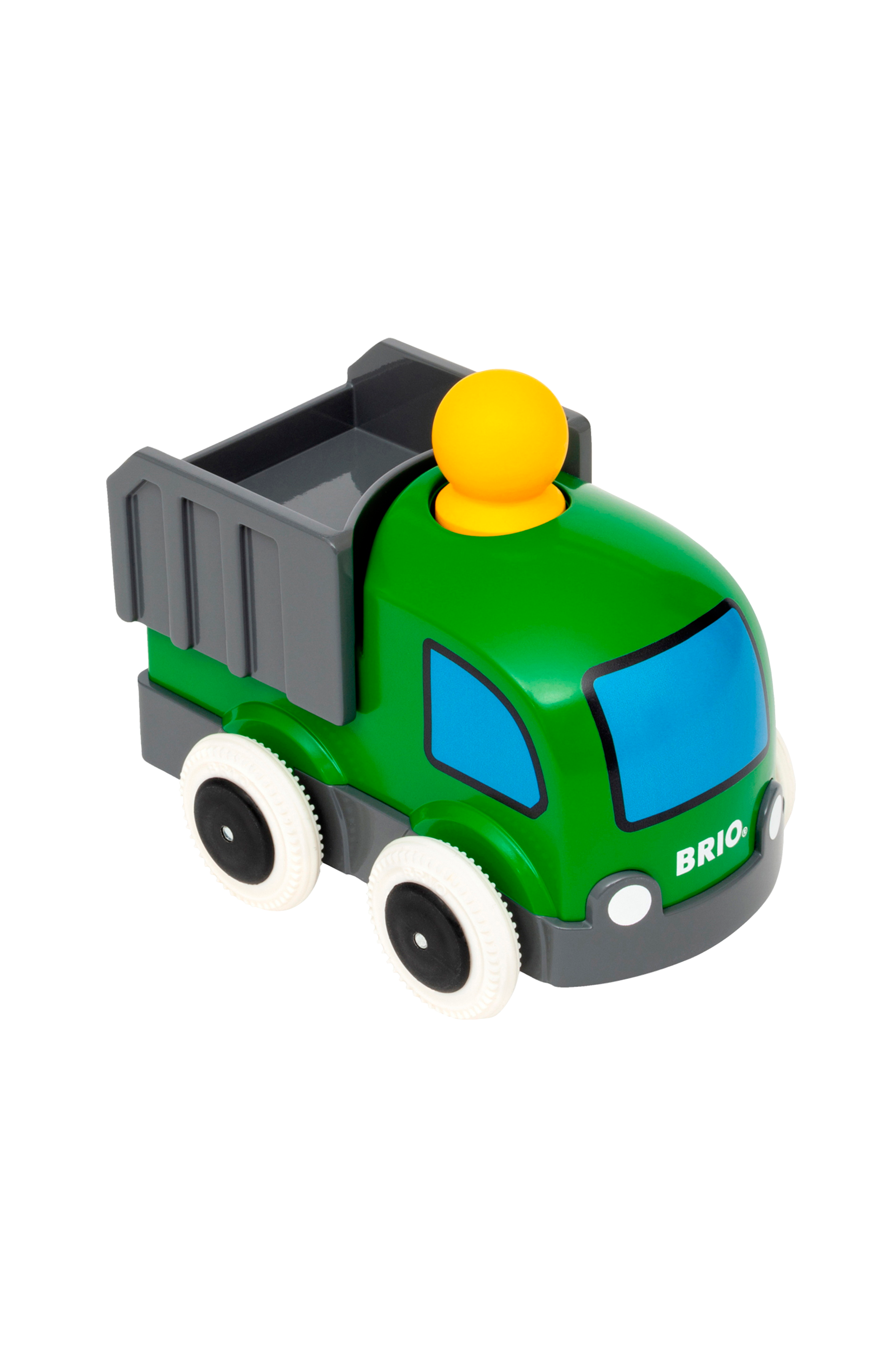 En lekfull leksakslastbil för småbarn som lär sig krypa och gå. Tryck helt enkelt lätt på förarens huvud så kör den iväg! Jaga efter den och låt det roliga börja. Lastbilen har också en fungerande container så att du kan lasta, transportera och lasta av dina leksaker.