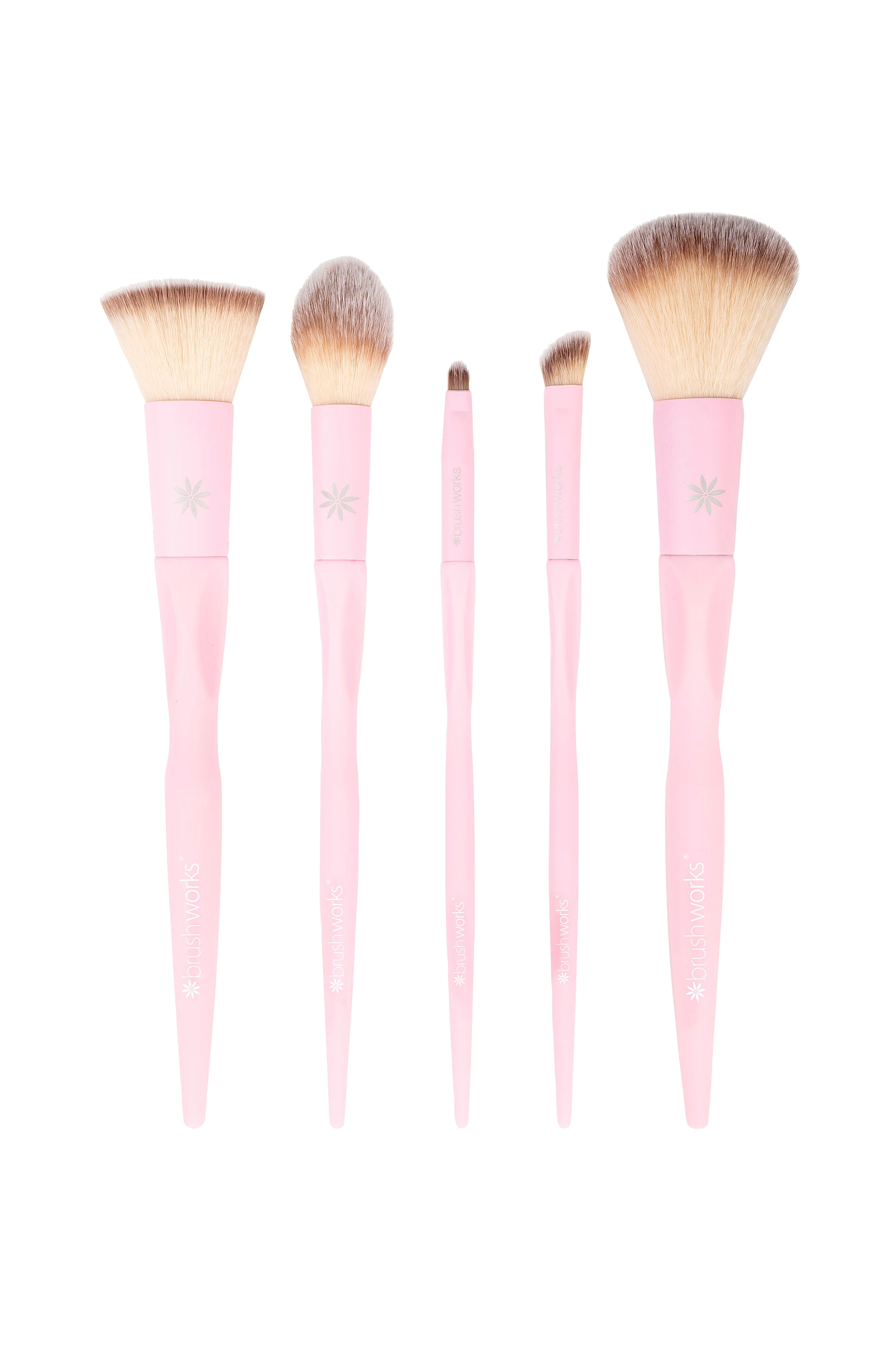Komplett set med fem borstar för att applicera flytande, kräm- och puderprodukter i ansiktet.