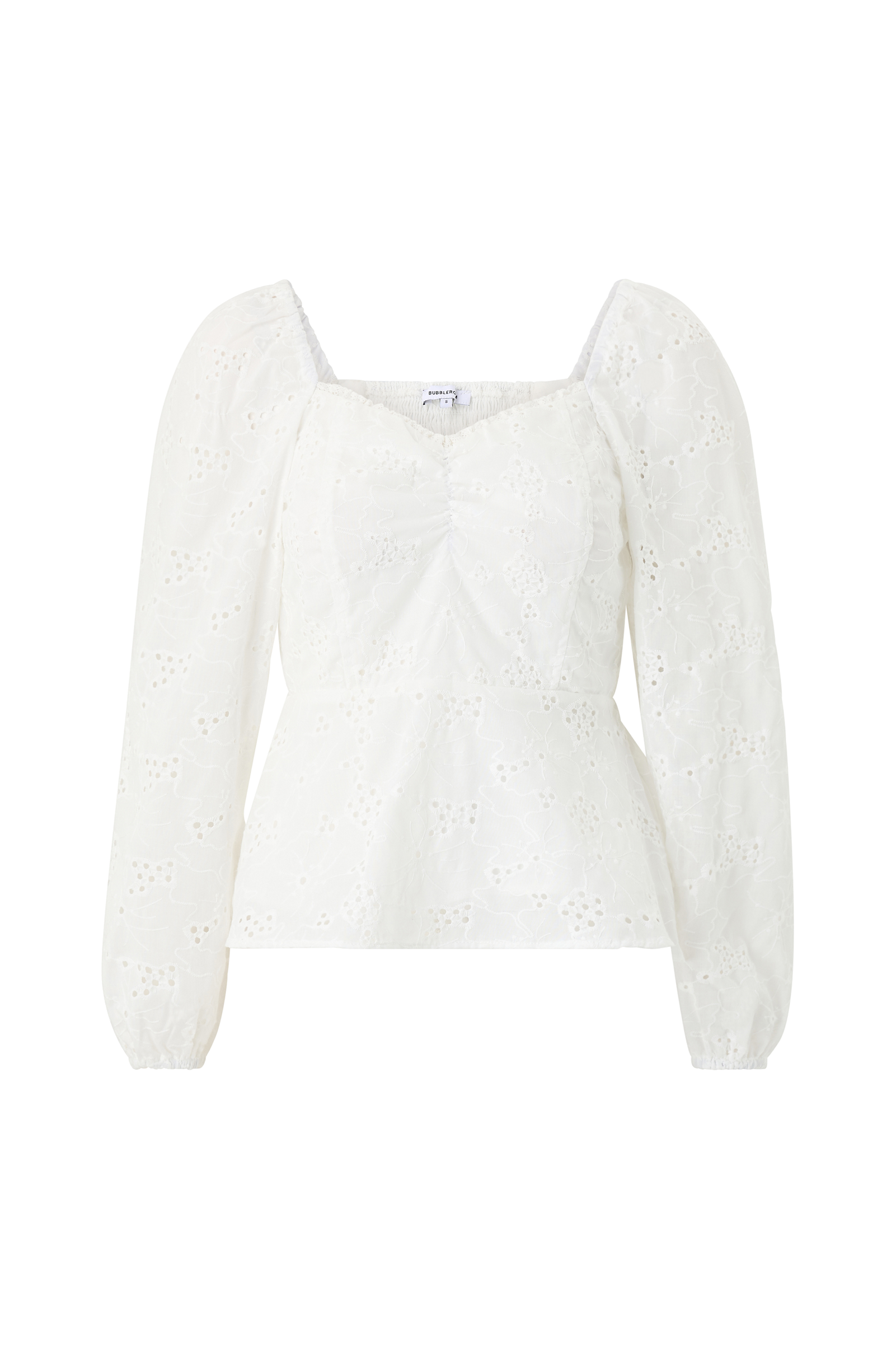 • Fodrad blus med hålbroderier• Hjärtformad halsringning med rynk framtill• Långa puffärmar med elastiska ärmslut• Smock i ryggen• Avskärning i midjan med utsvängd nederdel