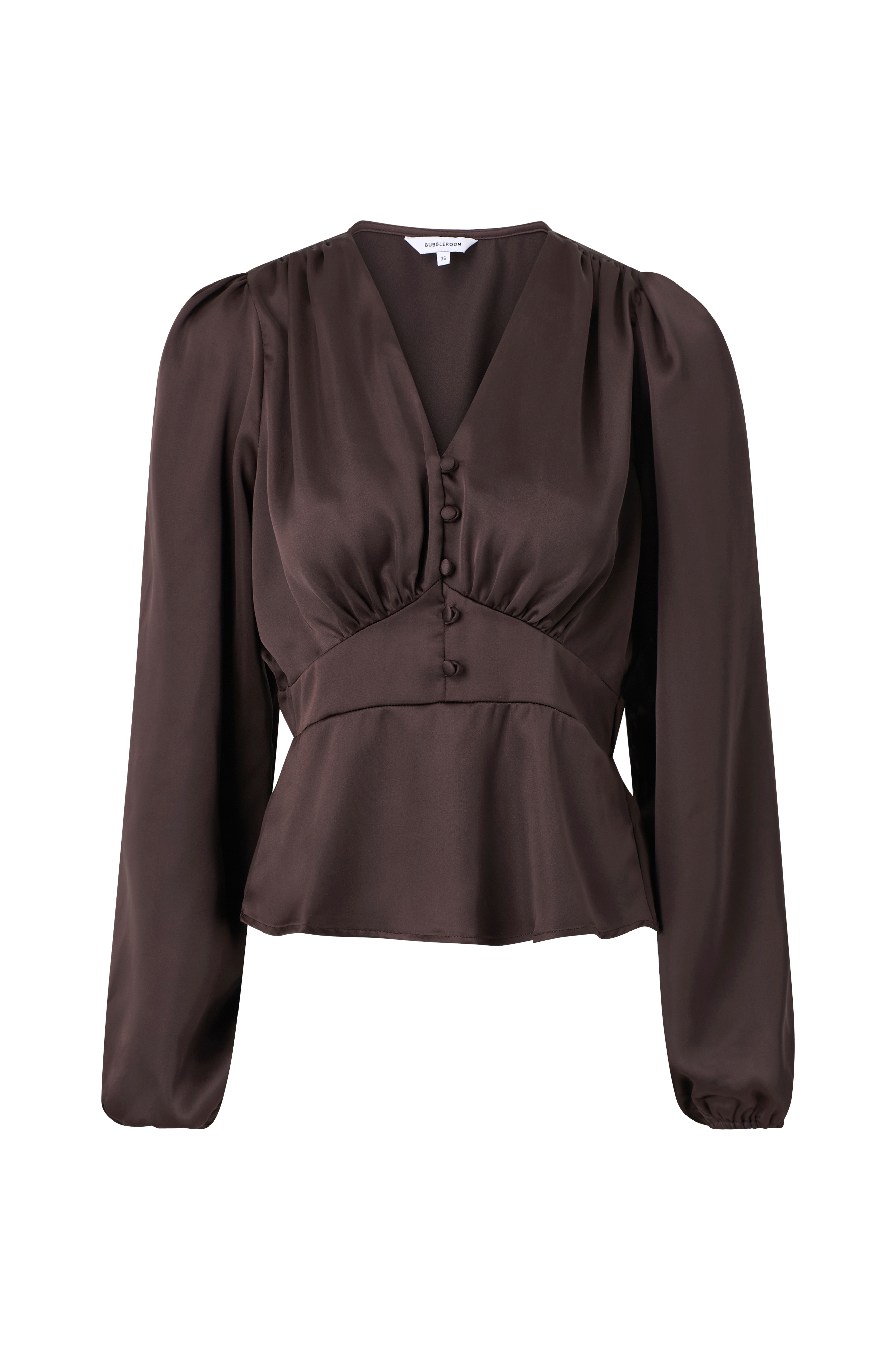 • Blus i satin med v-ringad hals• Rynk på axlarna• Långa ballongärmar med resår i ärmsluten• Dekorativa, klädda knappar fram• Avskärning i midjan med resår bak• Utsvängd nederdel