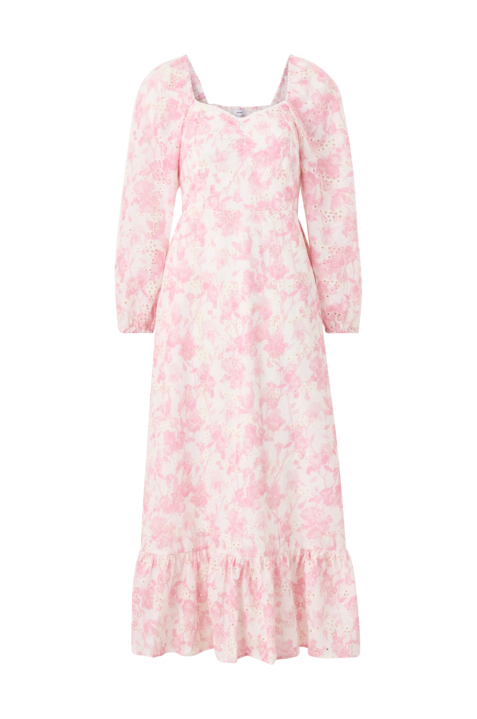 • Lång klänning med broderie anglaise• Fyrkantig halsringning• Långa puffärmar• Smock i ryggen• Volang nedtill• Textilfoder• Längd: 135 cm i storlek S