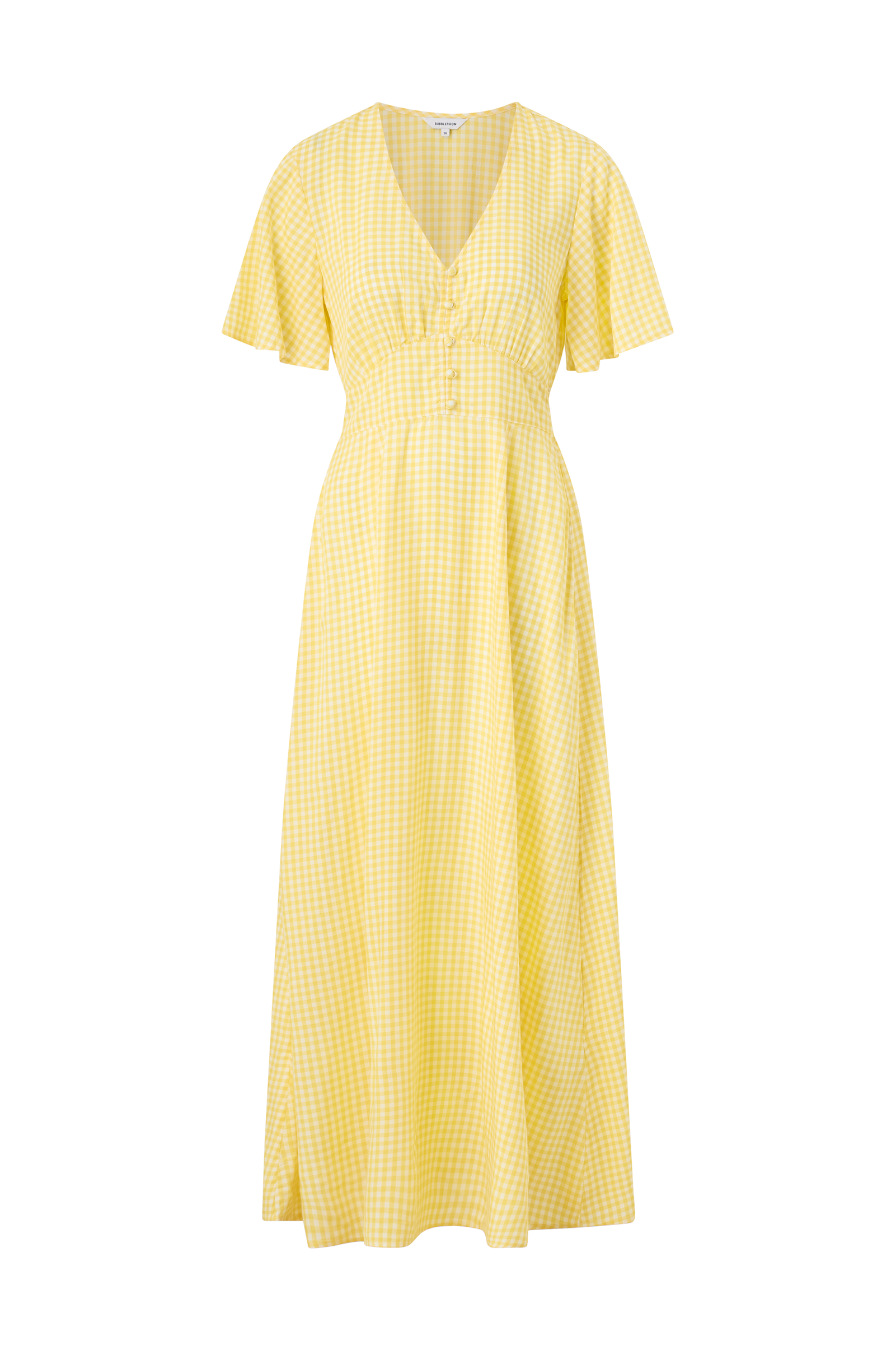 • Lång, luftig klänning i viskos• Djup v-ringning• Fuskknäppning framtill med dekorativa knappar• Markerad midja med smock baktill• Fjärilsärmar• Längd: 139 cm i storlek 36