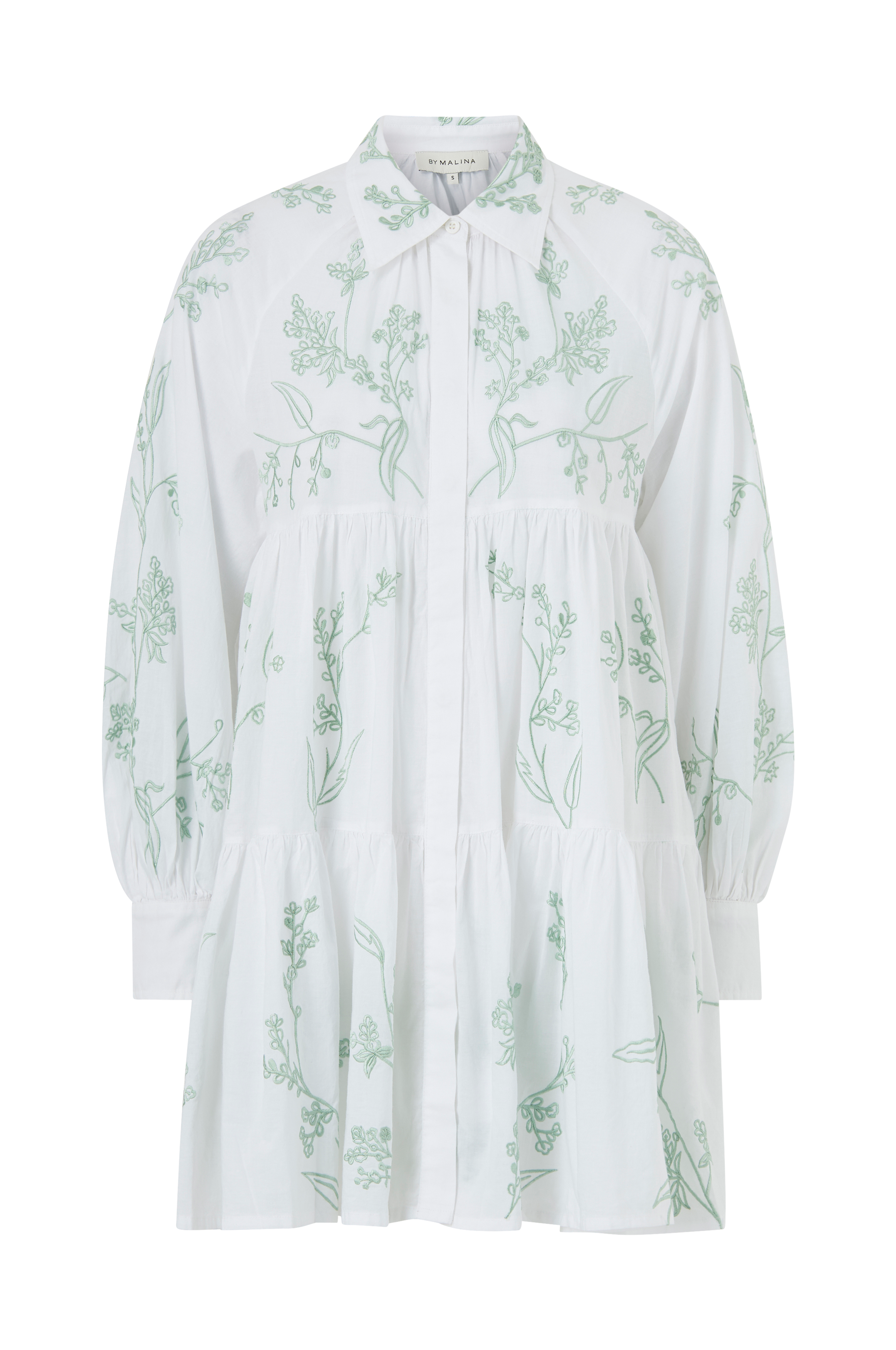 Utsvängd oversizemodell i vävd kvalitet med broderier över hela. Skjortkrage och knäppning med dolda knappar hela vägen fram och raglanskuren ärm med manschett i ärmslut. Avskärning med rynk i midjan och bred, påsydd volang i nederkanten. Längd ca 86 cm i stl S.