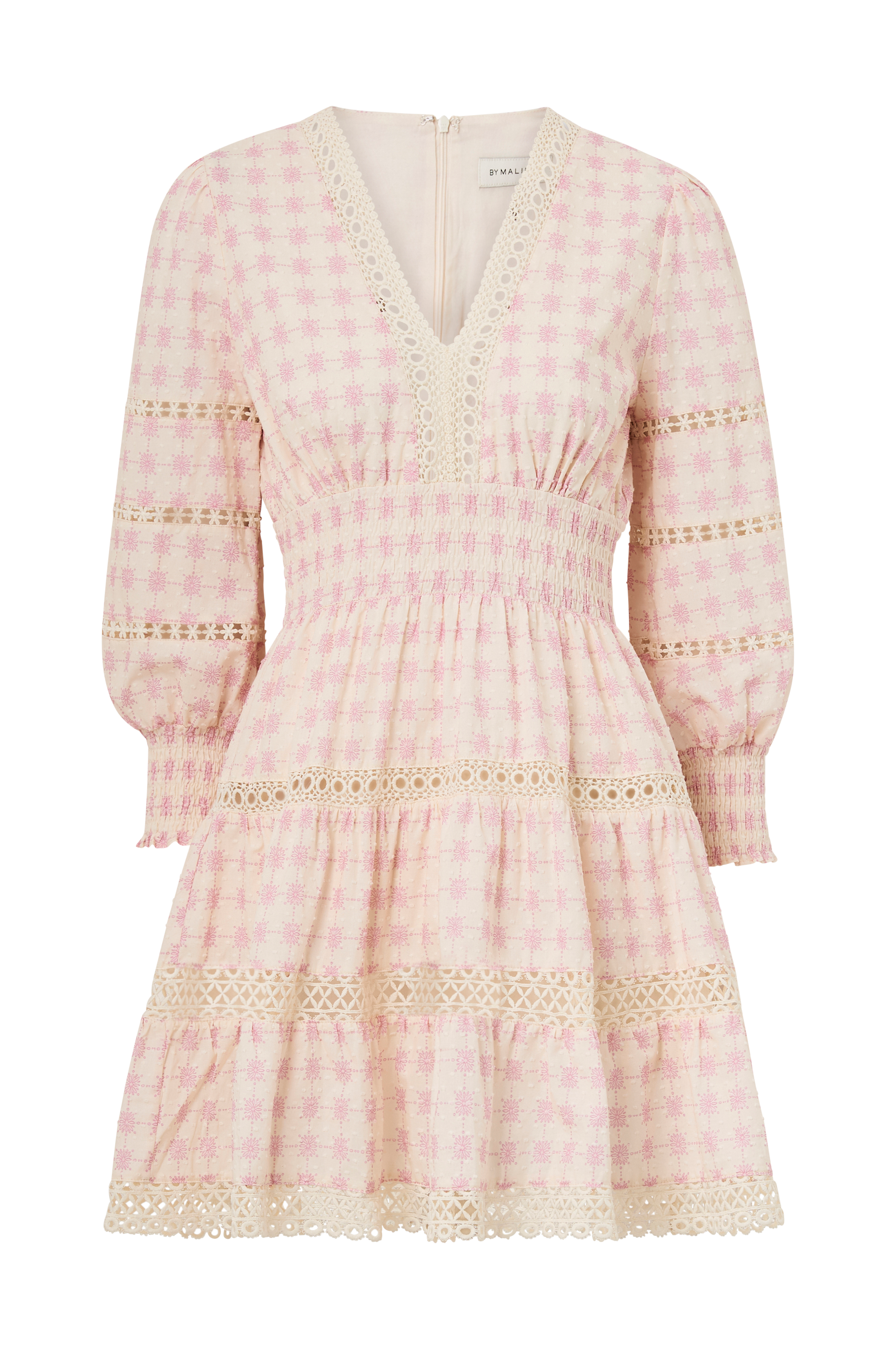 Klänning Inez Dress från By Malina med strukturprickar och virkad spets. Djup v-ringning fram, smock i midjan och kort, utställd kjol. Ärm med smockresår i ärmslut och hålspets. Dold dragkedja bak. Fodrad. Längd ca 90 cm i stl S.