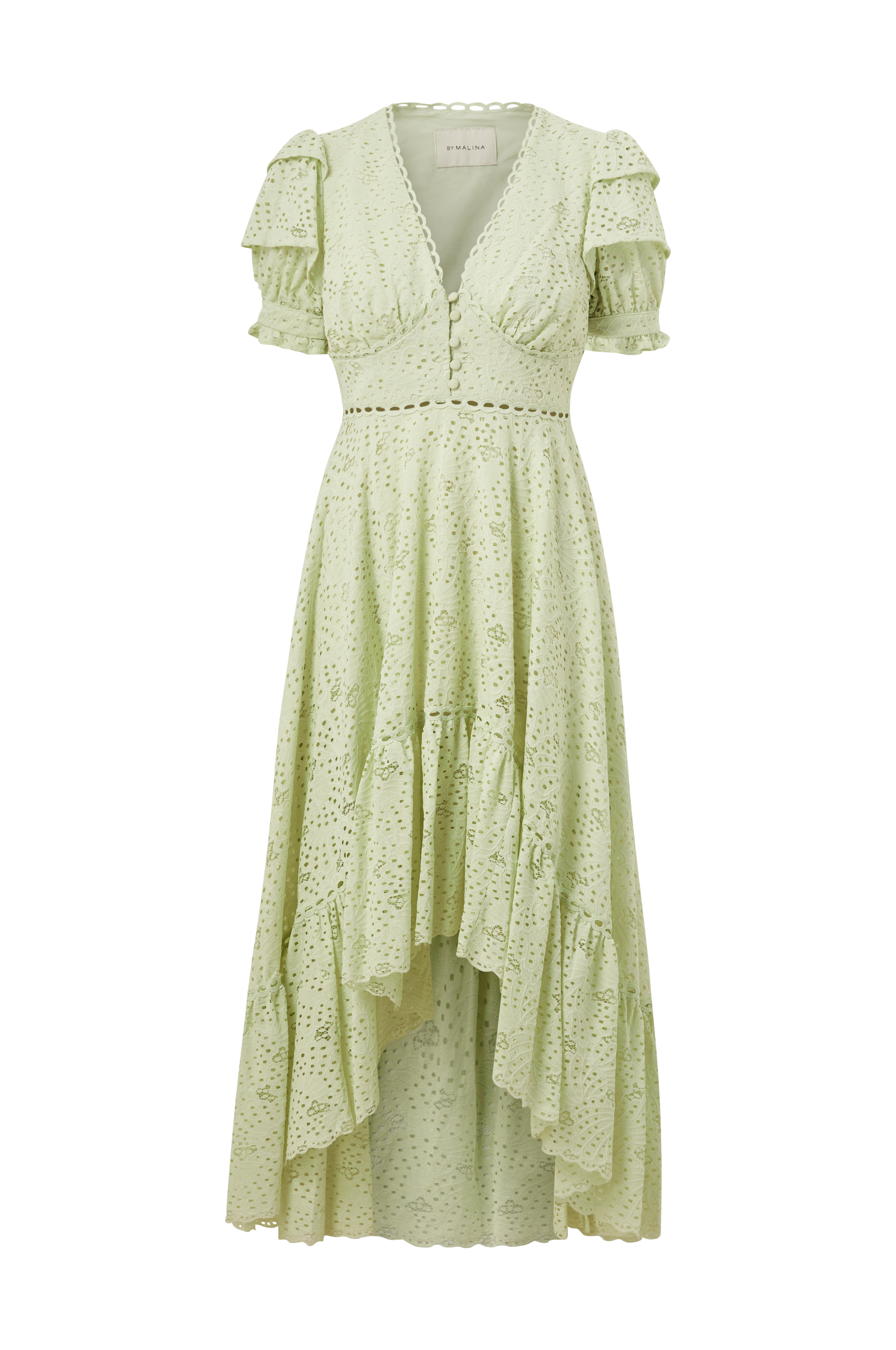 • Klänning i spets• V-ringning med knappar fram• Korta ärmar med volanger• Kortare kjol fram• Fodrad• Dold dragkedja i sidan• Längd: 132 cm i storlek S
