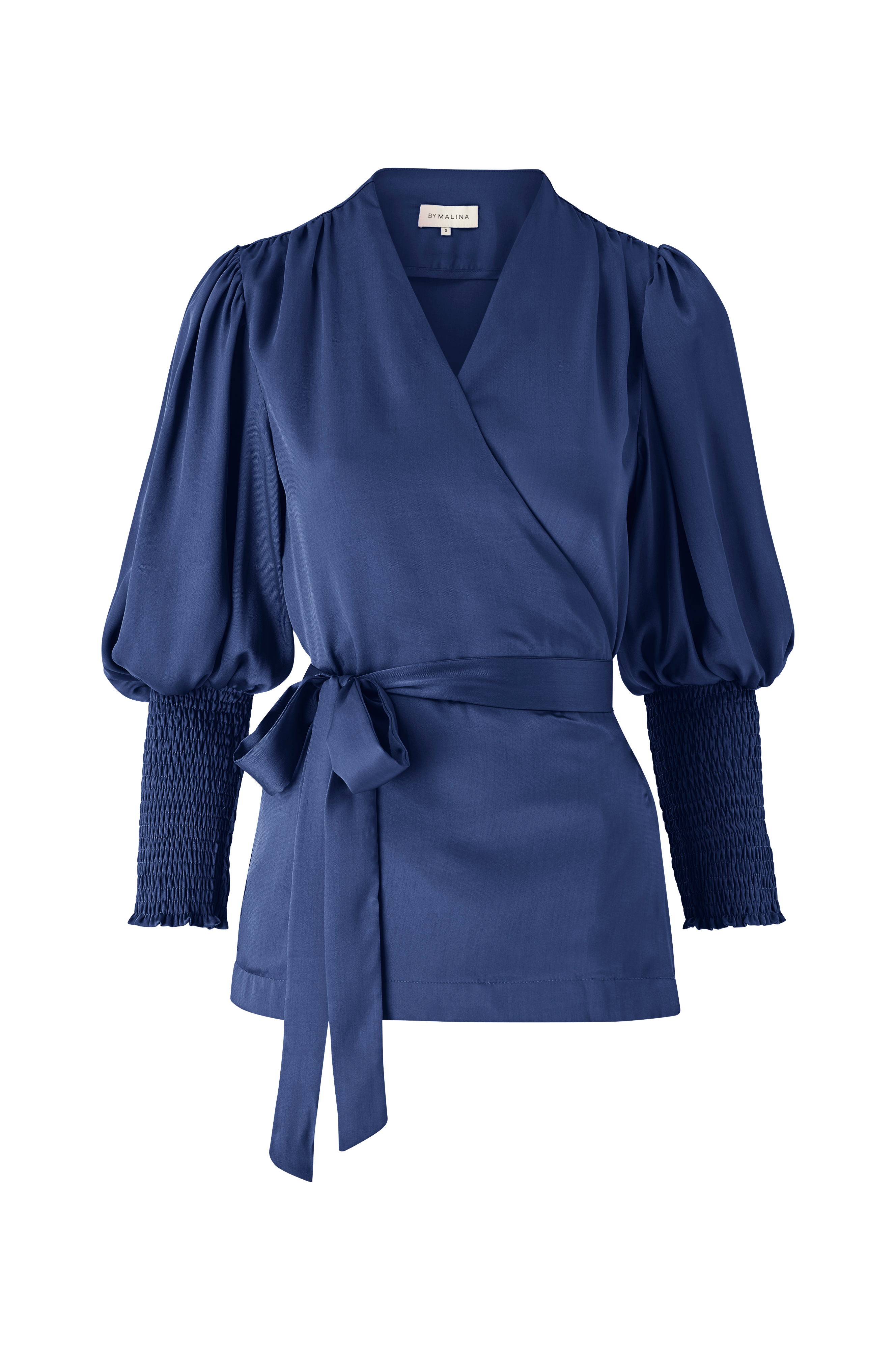 Omlottblus Hope Blouse från By Malina. Öppen omlottmodell med långt knyt i sidan. Lång puffärm med rynk vid axeln och bred smockresår i ärmslut. Vävd satin av återvunnen polyester.
