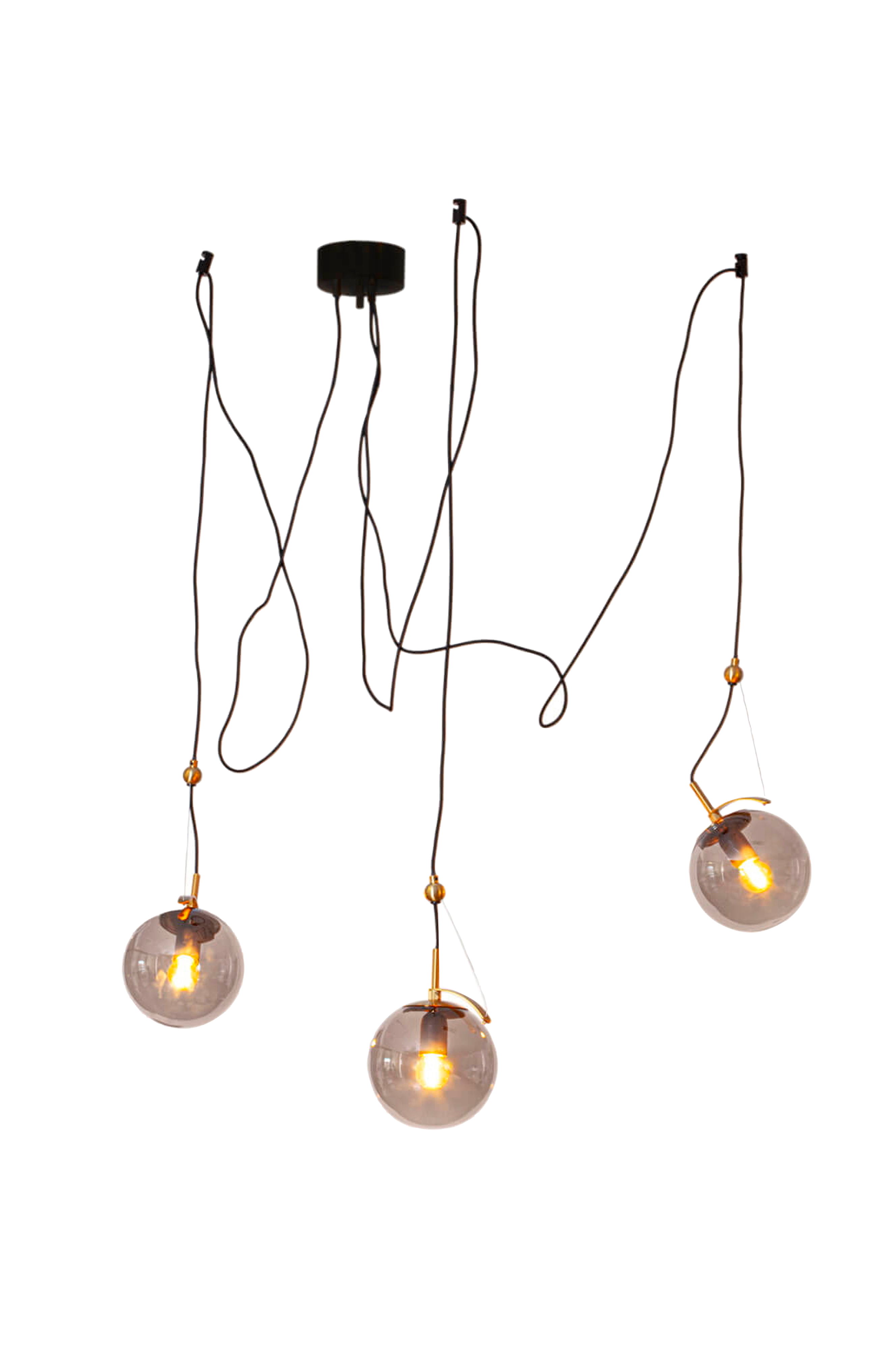 Taklampan carry är en elegant och stilren belysning som förhöjer atmosfären i ditt hem. Med sina tre grå glaskupor och vackra mässingsdetaljer på de svarta upphängningarna utstrålar den en modern och sofistikerad känsla.