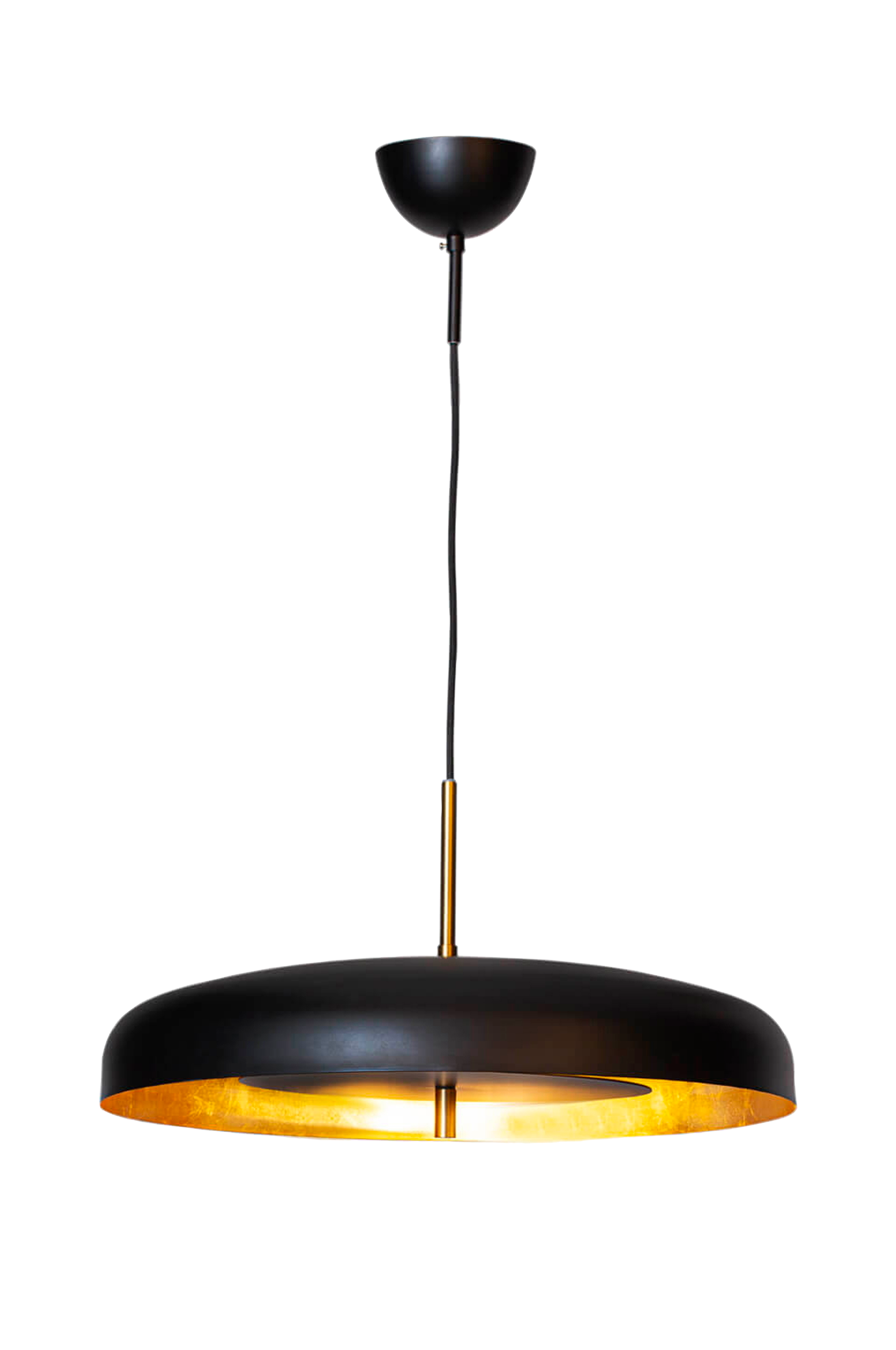 Den svarta metallen ger lampan en slank och elegant estetik, medan den guldfärgade insidan ger ett varmt och inbjudande sken när lampan är tänd. Resultatet är en atmosfär som utstrålar industriell elegans, med en subtil touch av karaktär som förhöjer din matplats.