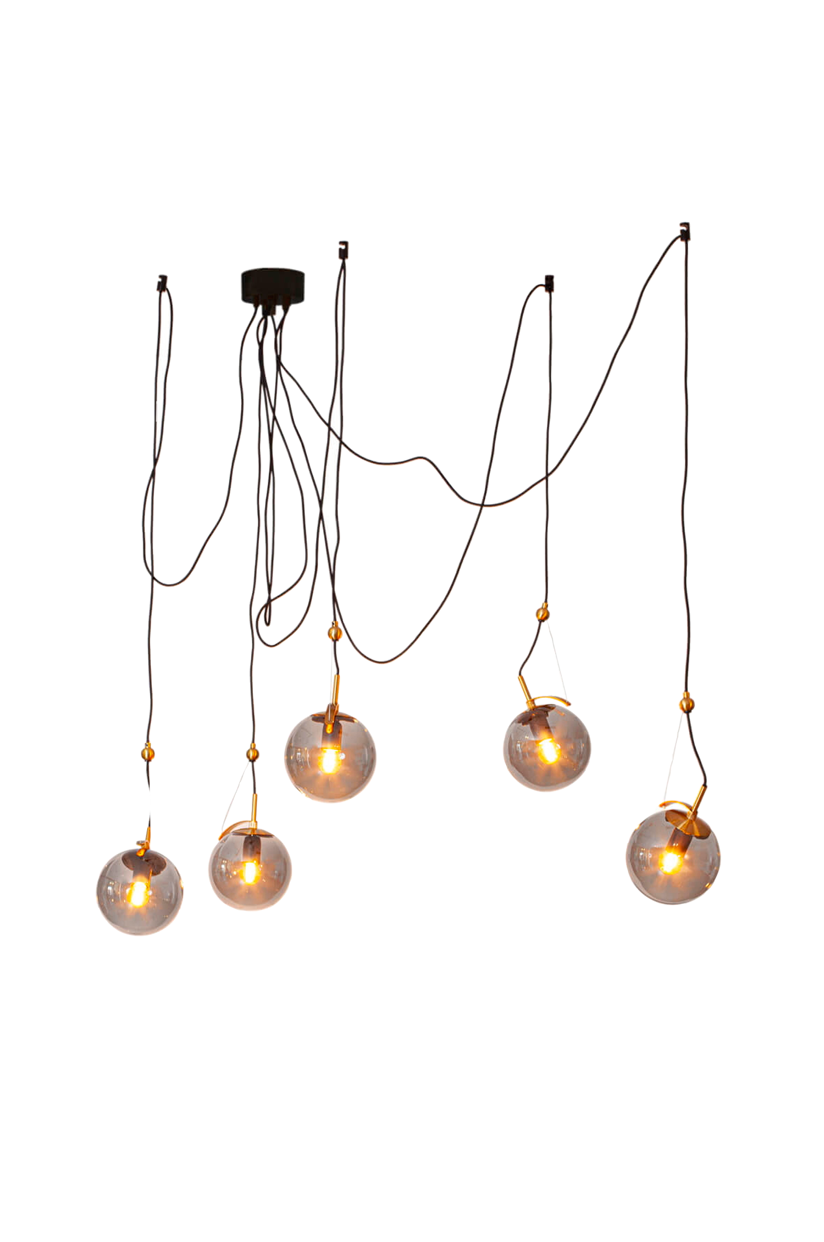 Taklampan carry är en fantastisk belysningsarmatur som höjer stämningen i alla utrymmen. Med fem grå glaskupor som pryds av mässingsdetaljer på de svarta upphängningarna utstrålar den en modern och sofistikerad charm.