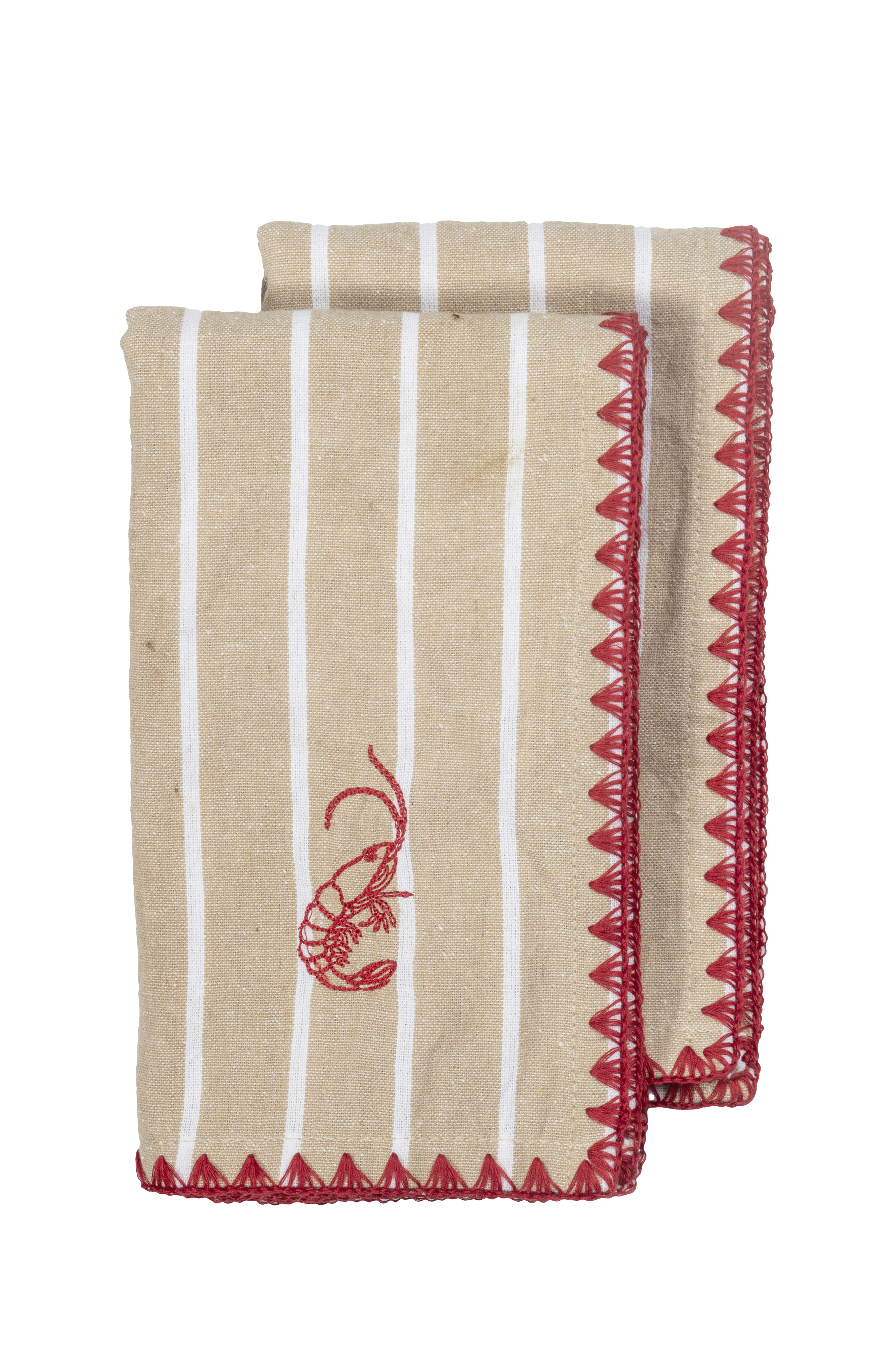 Servetten Bubba har klassiska beige och vita ränder med en sydd kant och en röd kontrast för en elegant touch. En lekfull broderad räka ger karaktär och gör varje dukning unik. Matcha perfekt med duken och kökshandduken från samma serie för en sammanhängande, elegant look. Tillverkad av 70% återvunnen bomull och 30% återvunnen polyester. Mått: 45x45 cm: 45x45 cm. Levereras i ett tvåpack, knutet med band och rosett. Designad av Byon Studio.