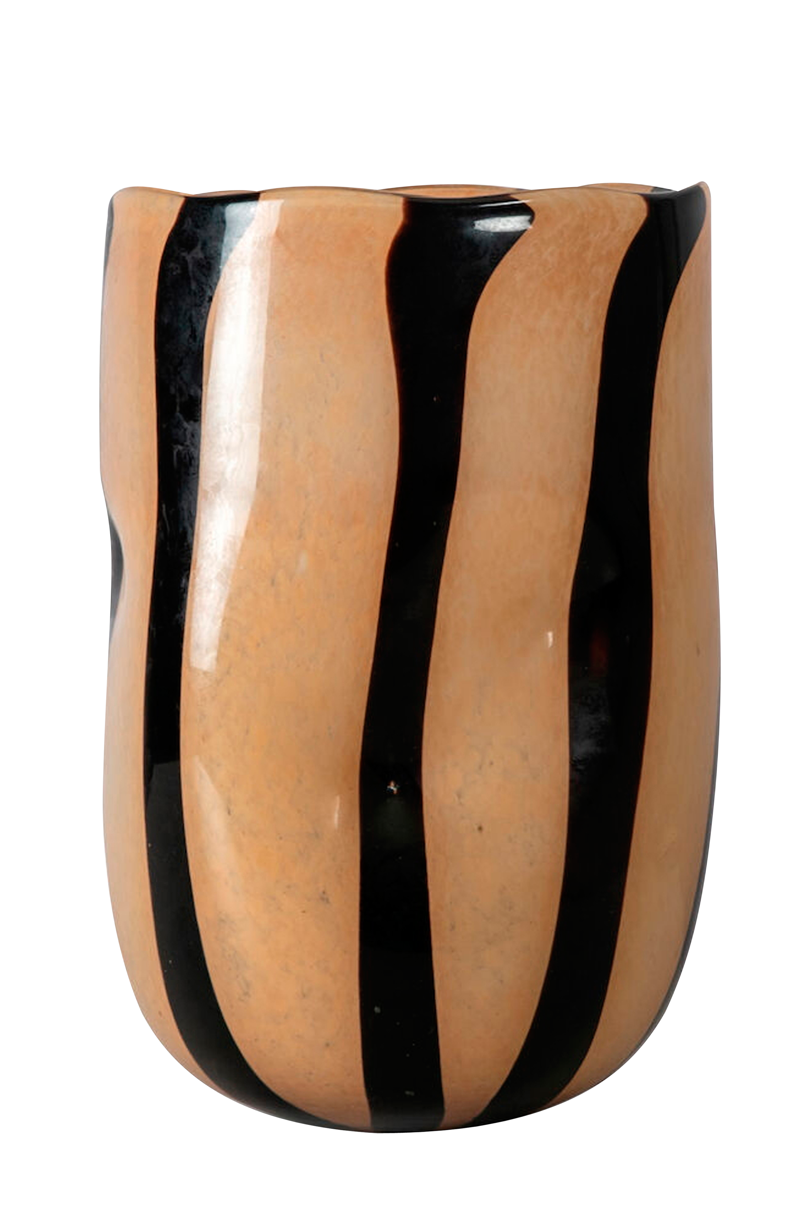 Vas Curt är en handgjord statement-vas i glas med randiga kurvor som sätter tonen på bordet. Vi får känslan av en ihopklämd påse fylld med hemligheter som du kan bevara under lång tid. Lika vacker för sig själv som fylld med måndagsbuketten hela veckan. Vase Curt tillhör familjen Curve där du finner flertalet vaser, lyktor och fat. Höjd 30 cm och diameter 20 cm.