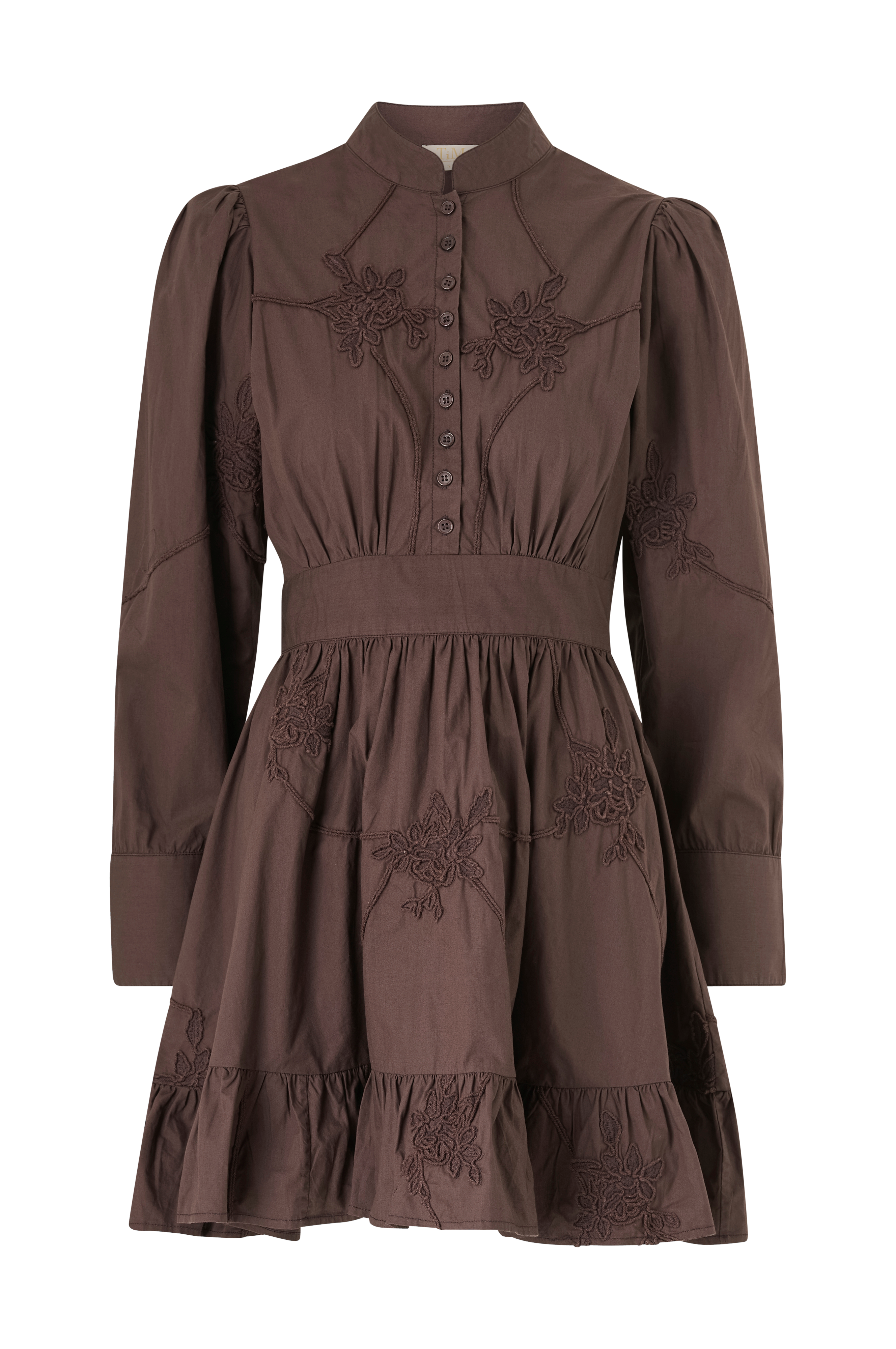 • Klänning i bomullspoplin med krage• Dekorativa broderier över hela• Knappslå upptill• Långa puffärmar med breda manschetter• Markerad midja• Utsvängd kjol med volang nedtill• Längd: 87 cm i storlek S