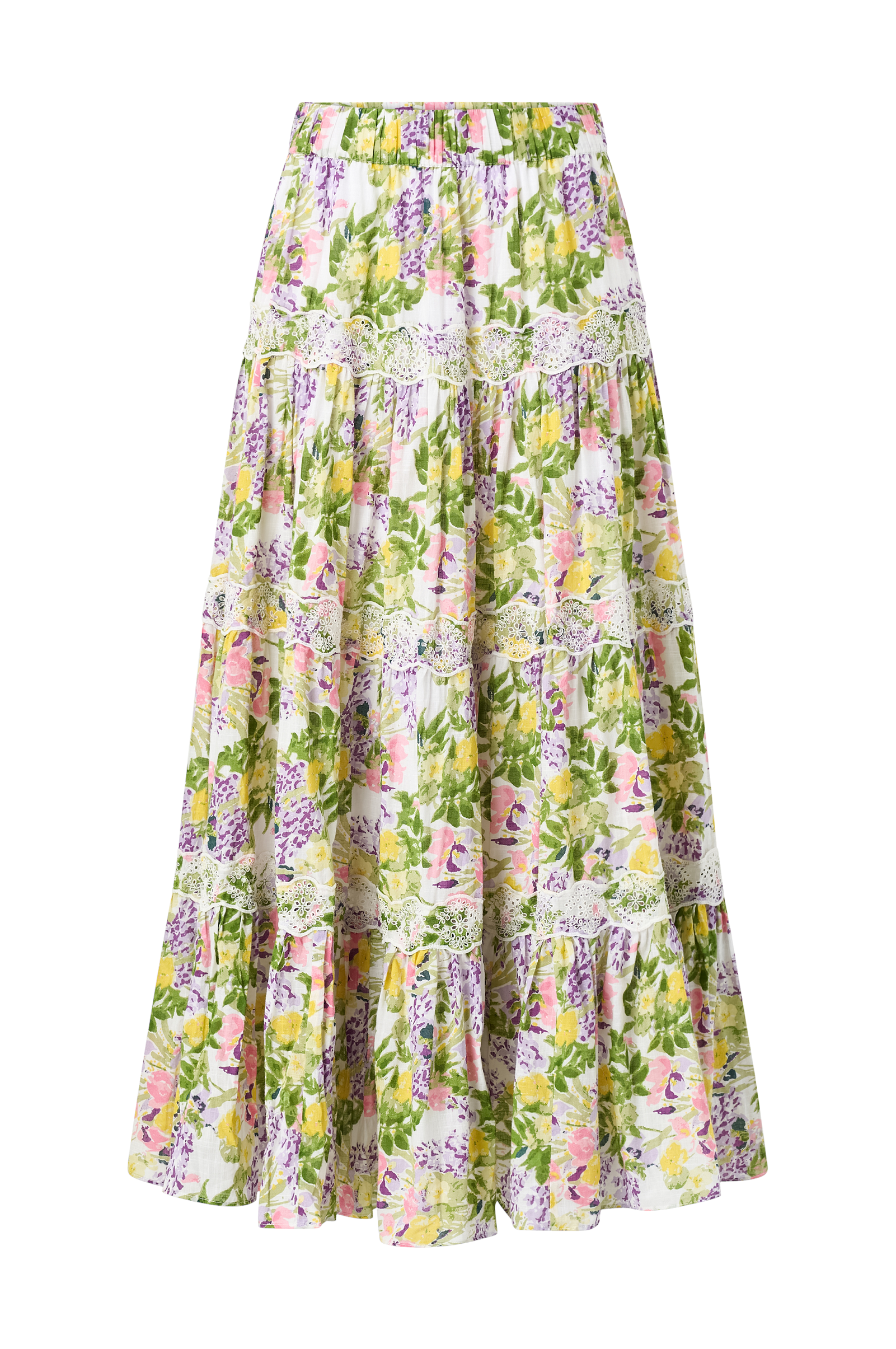 • Lång, mönstrad kjol i slub-bomull• Vid, a-linjeskuren modell med dekorativt spetsband• Bred, invändig resår i midjan med dold dragkedja i sidan• Tunt, vävt innerfoder• Längd: 102 cm i storlek S