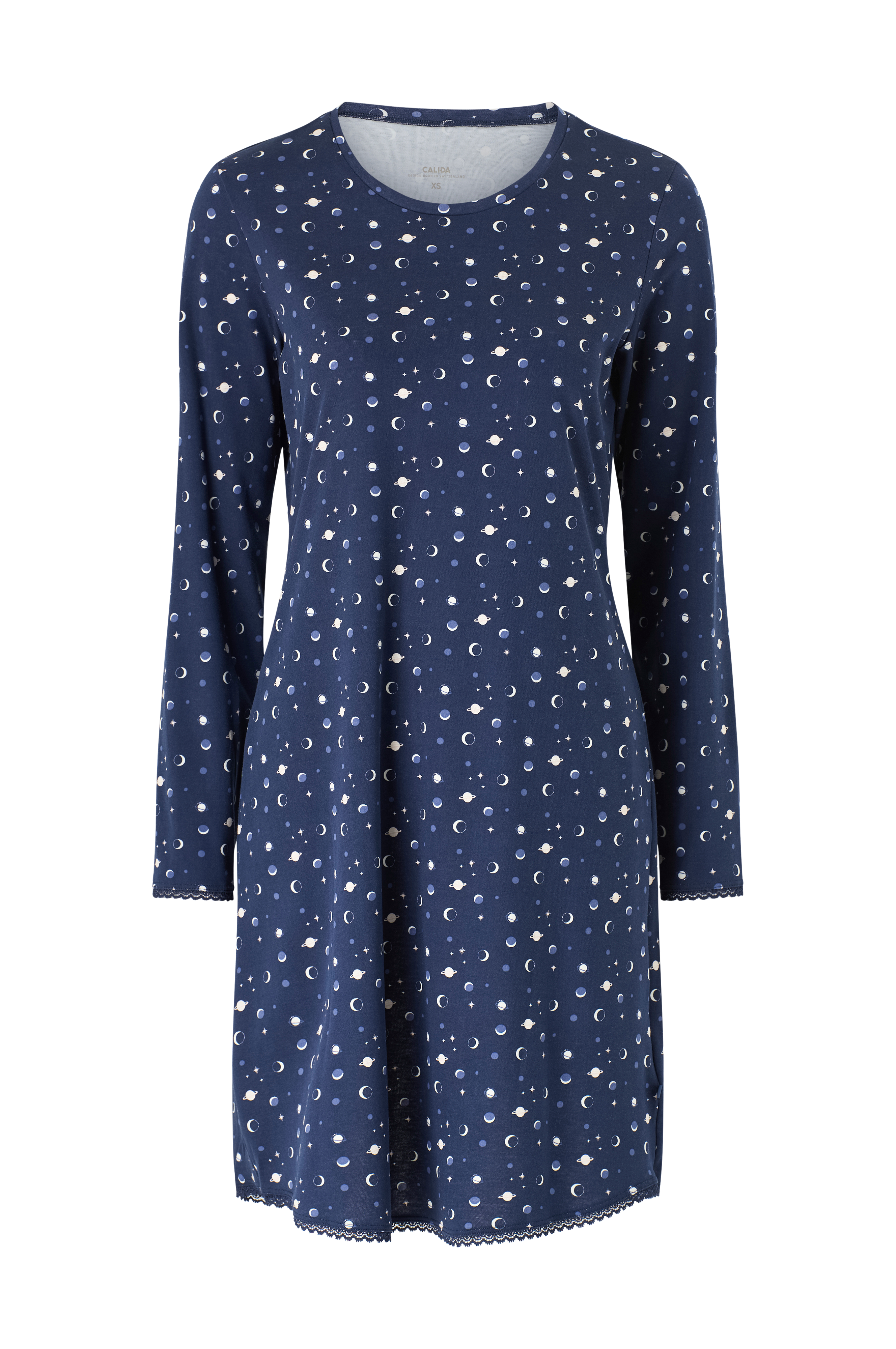 • Mjukt, mönstrat nattlinne i bomull• Rund halsringning• Långa ärmar• Lös passform• Spetskanter i ärmsluten och i nederkanten