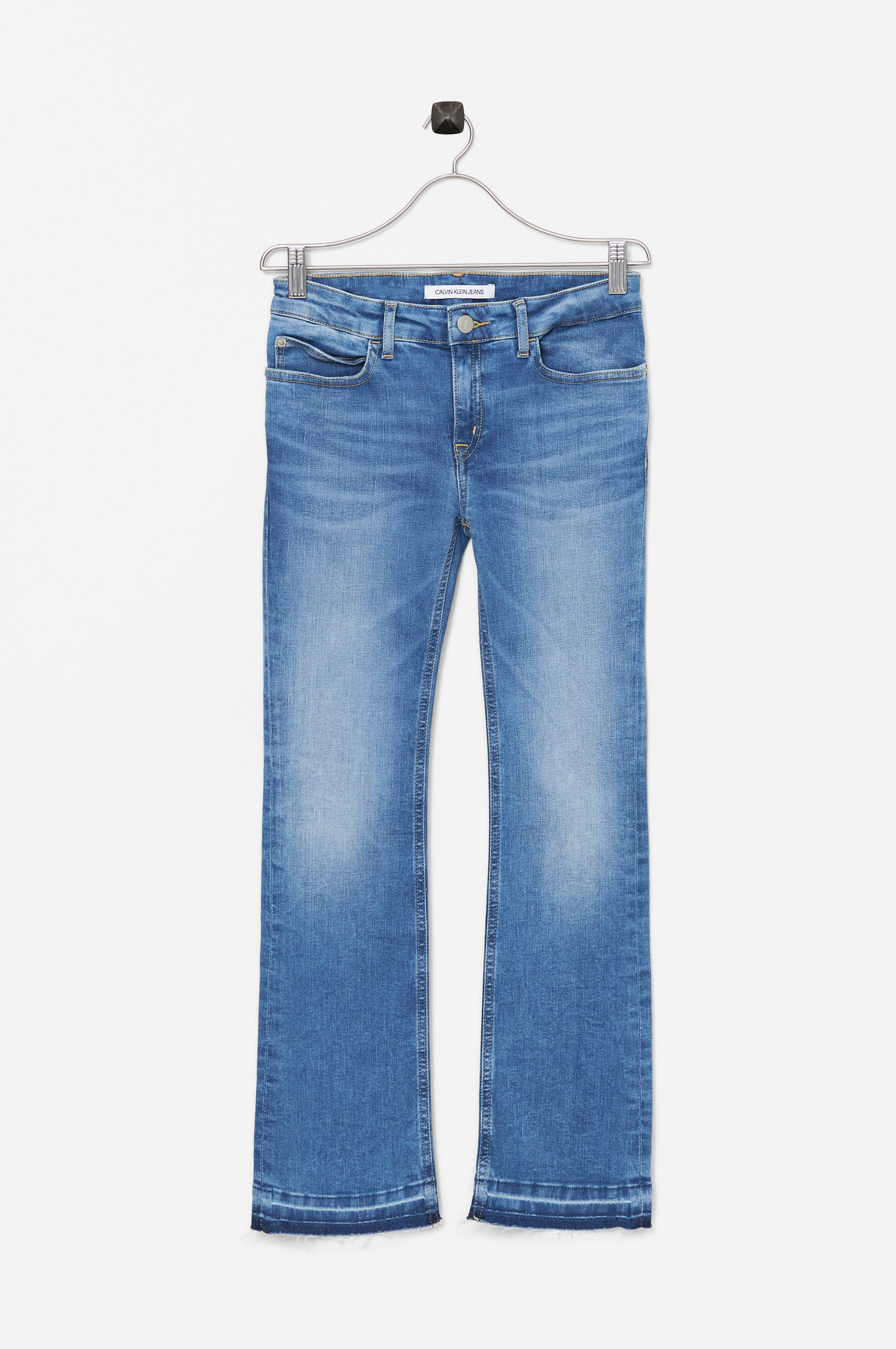 Jeans i stretchdenim. Flare-modell med utställda ben. Reglerbar linning och gylf med dragkedja. Tre fickor fram och två bakfickor.