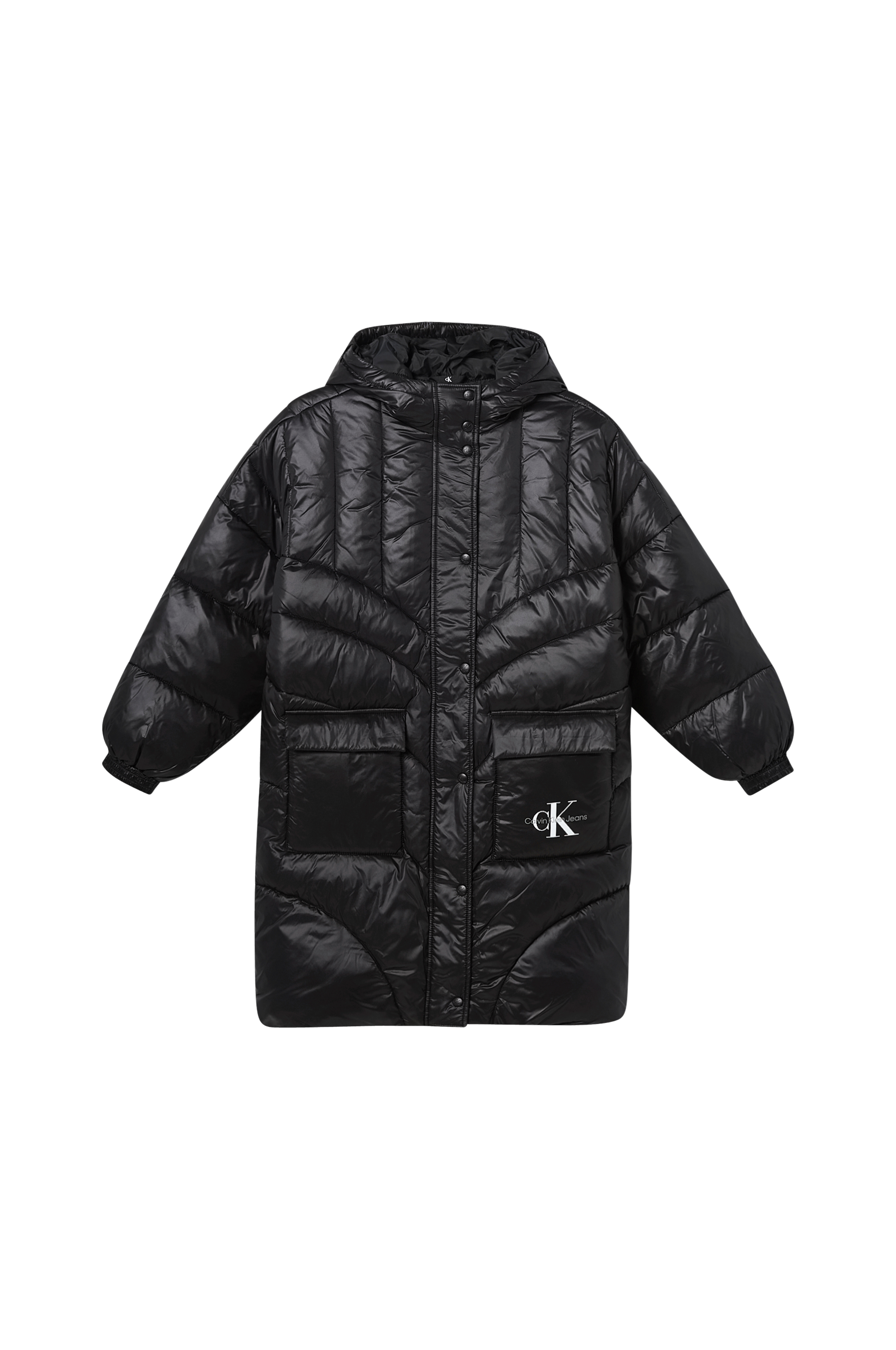 • Rak, vid modell • Knappslå med tryckknappar och dold tvåvägsdragkedja • Hög krage med vadderad huva • Fickor med lock • Resår i ärmsluten • Längd: 85 cm i storlek 12 • Produkten innehåller återvunnet material som har tagits tillvara för att minska mängden avfall, samtidigt som nya resurser inte har förbrukats.