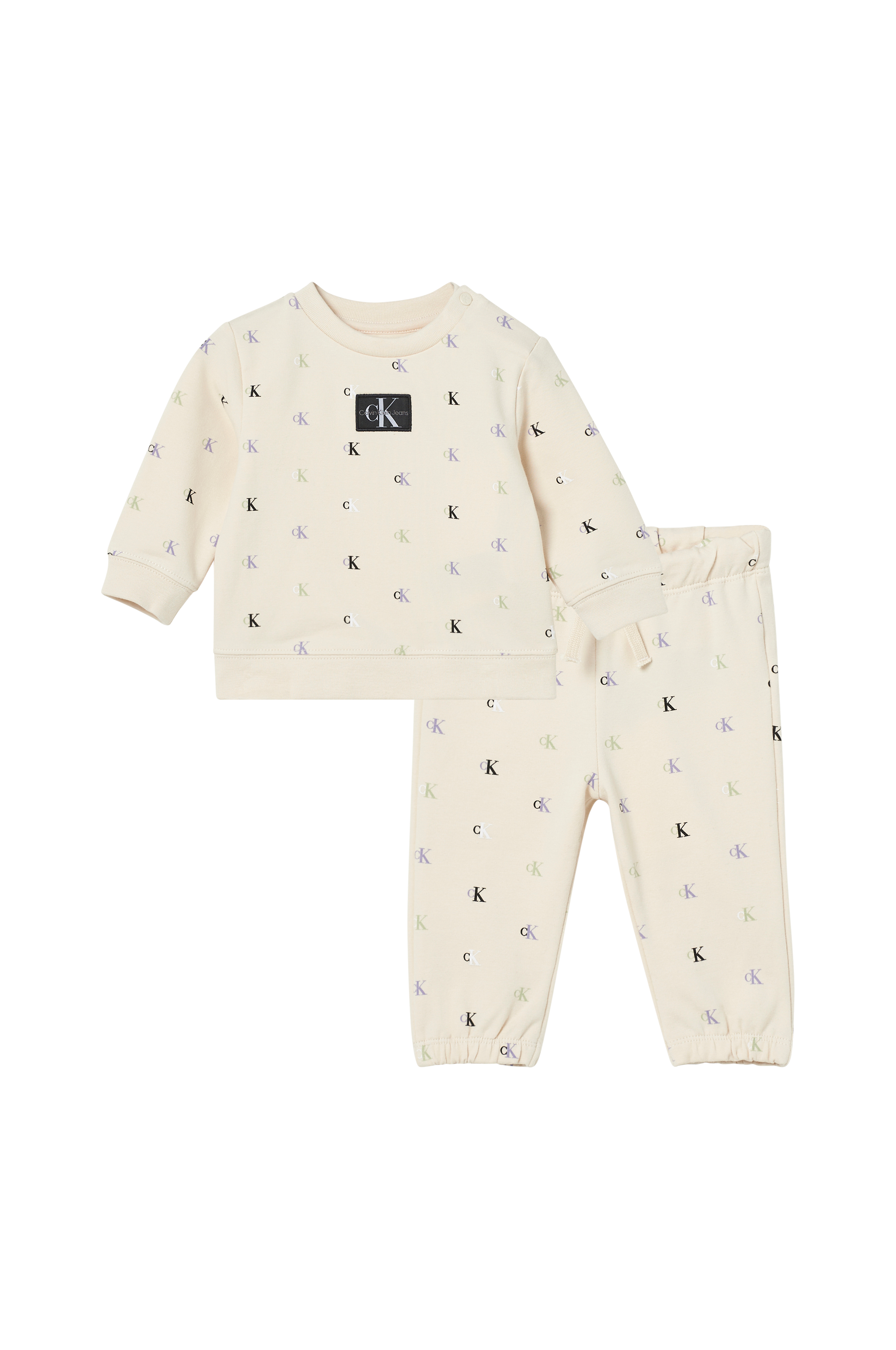 Set med sweatshirt och sweatbyxor i mjuk, stretchig bomullstrikå. Sweatshirten har en rund, ribbad halsringning och tryckknapp på ena axeln. Ribbmuddar i ärmsluten och nedtill. Sweatbyxorna har elastisk midja med dragsko. Resår i bensluten.
