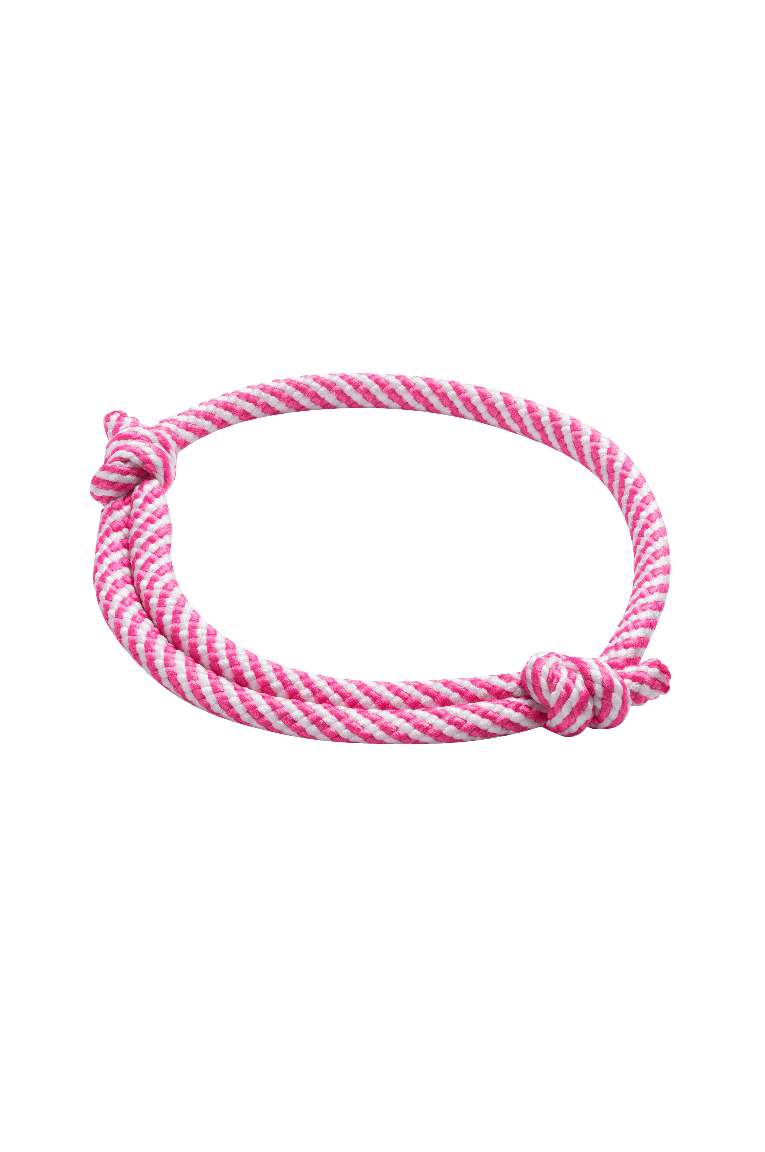 Armbandet är tillverkat av återvunna PET-flaskor. Det är randigt i rosa och vitt och matchar det rosa bandet.
