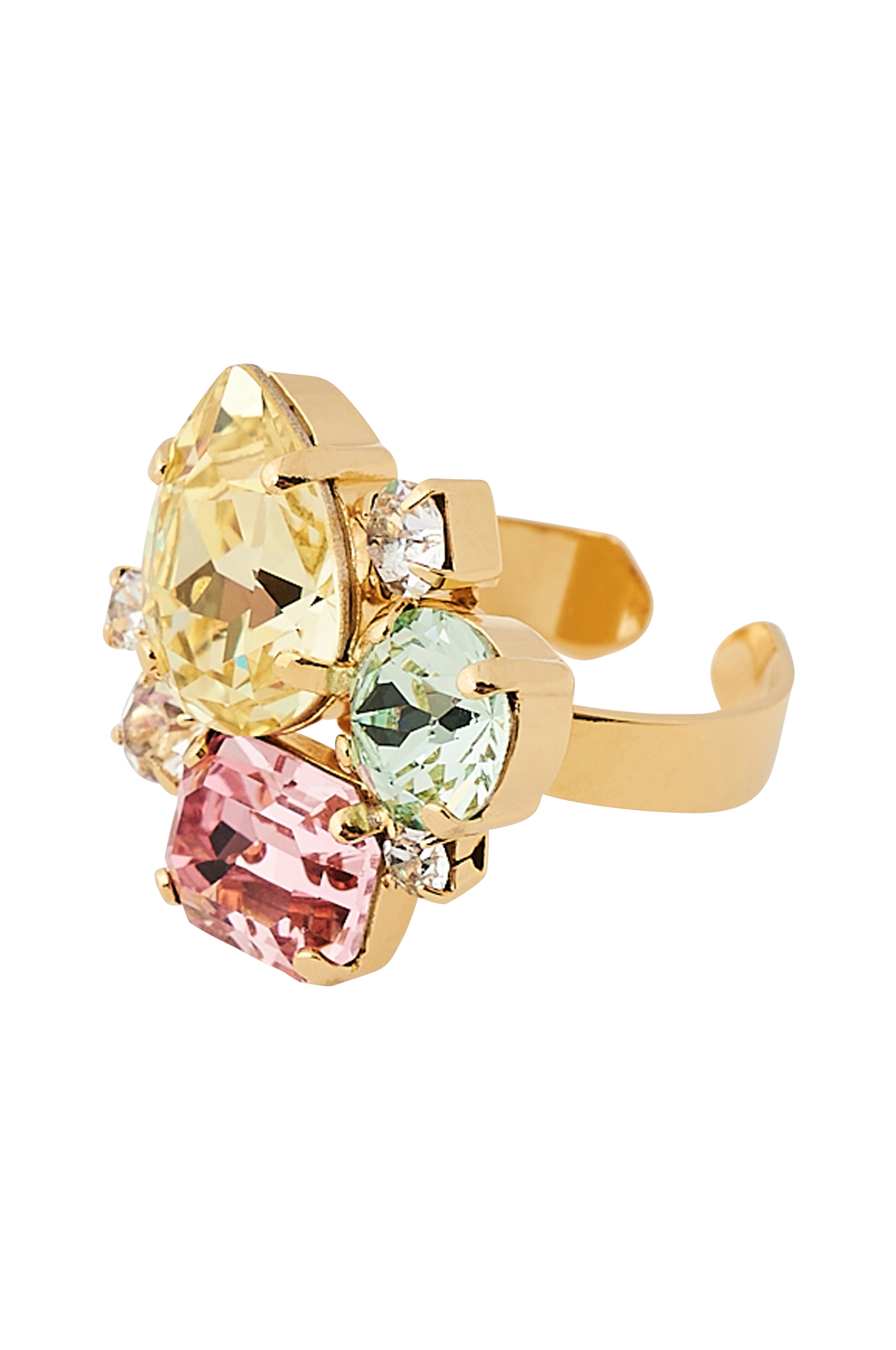 • Guldpläterad ring med kristaller• Gjord i mässing med 18 karats guldplätering• Designad i Sverige, handgjord i Grekland.• Mått: 2,3 x 2,3 cm