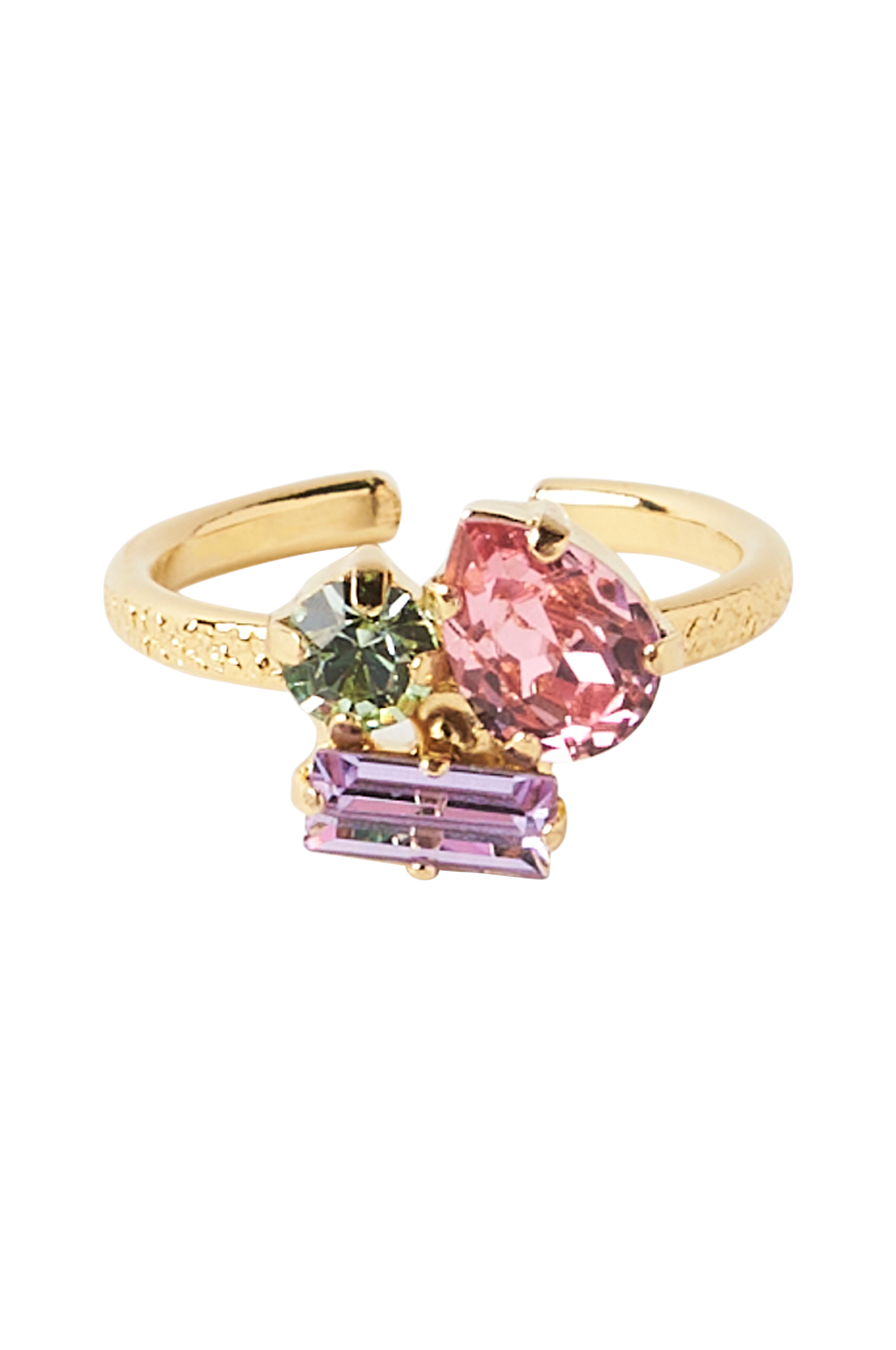 En vacker kombination av tre olika kristaller med unika former. Tillverkad av mässing med 18K guldplätering. Öppen baksida som kan justeras i storlek. Designad i Sverige, handgjord i Grekland.