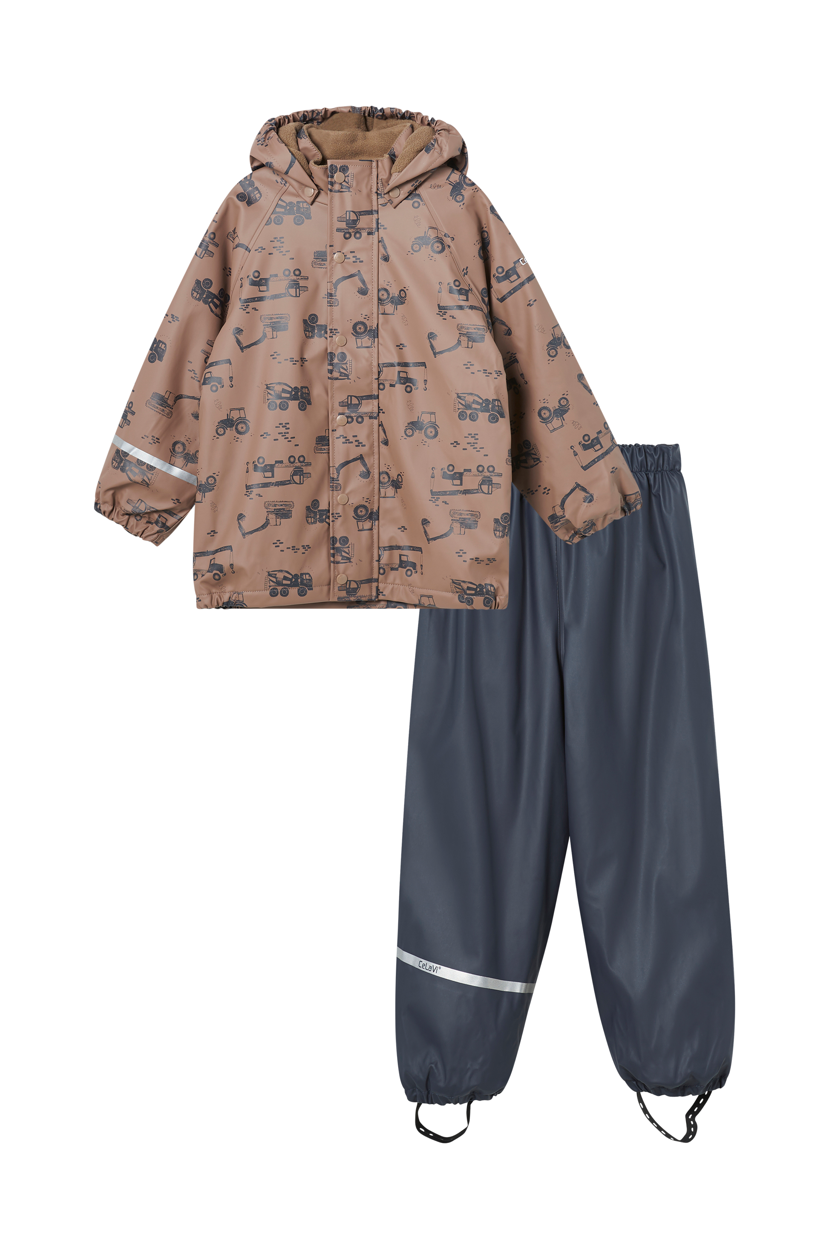 • Regnset med jacka och byxor • Foder i mjuk, varm fleece • Jacka med avtagbar huva • Hög krage • Dragkedja • Vindslå över dragkedjan med tryckknappar • Resår i ärmsluten • Byxor med elastisk midja med invändig dragsko • Resår i bensluten • Avtagbara, elastiska fothällor • Reflexdetaljer
