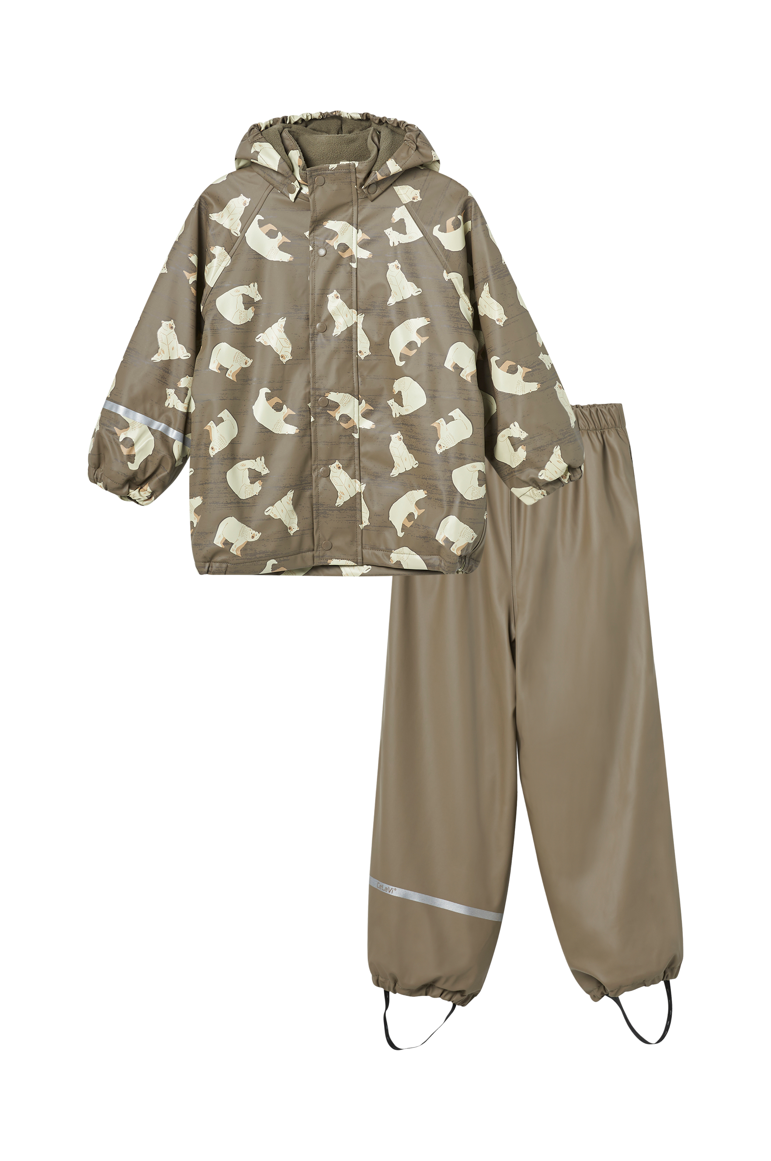 • Regnset med jacka och byxor • Foder i mjuk, varm fleece • Jacka med avtagbar huva • Hög krage • Dragkedja • Vindslå över dragkedjan med tryckknappar • Resår i ärmsluten • Byxor med elastisk midja med invändig dragsko • Resår i bensluten • Avtagbara, elastiska fothällor • Reflexdetaljer
