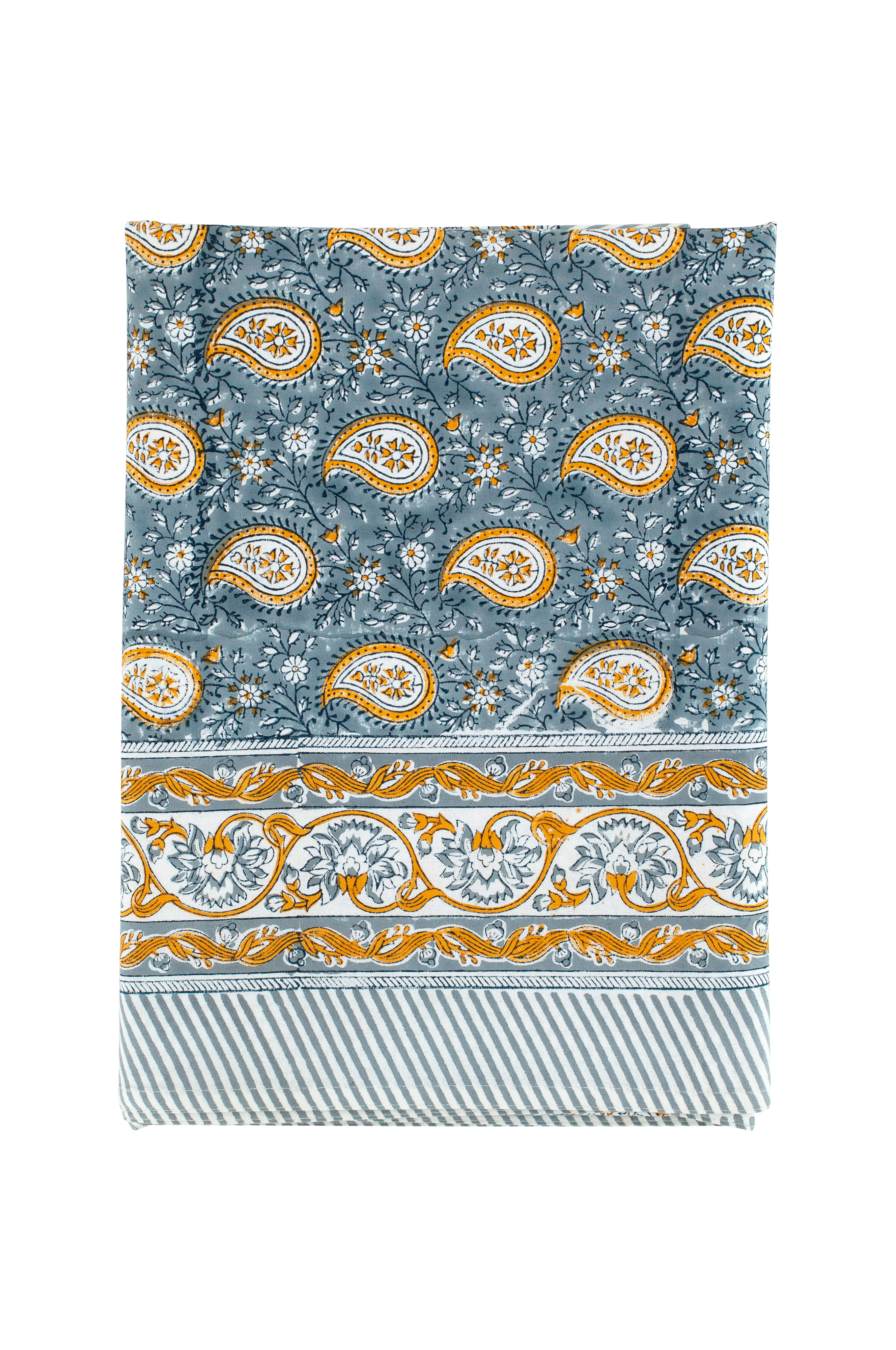 En vacker bordsduk med ett dekorativt paisley -mönster och prydnadsrand. Varje duk är omsorgsfullt handtryckt med hjälp av den urgamla träsnittskonsten, en beprövad teknik som ger djup, textur och själ till varje textil.