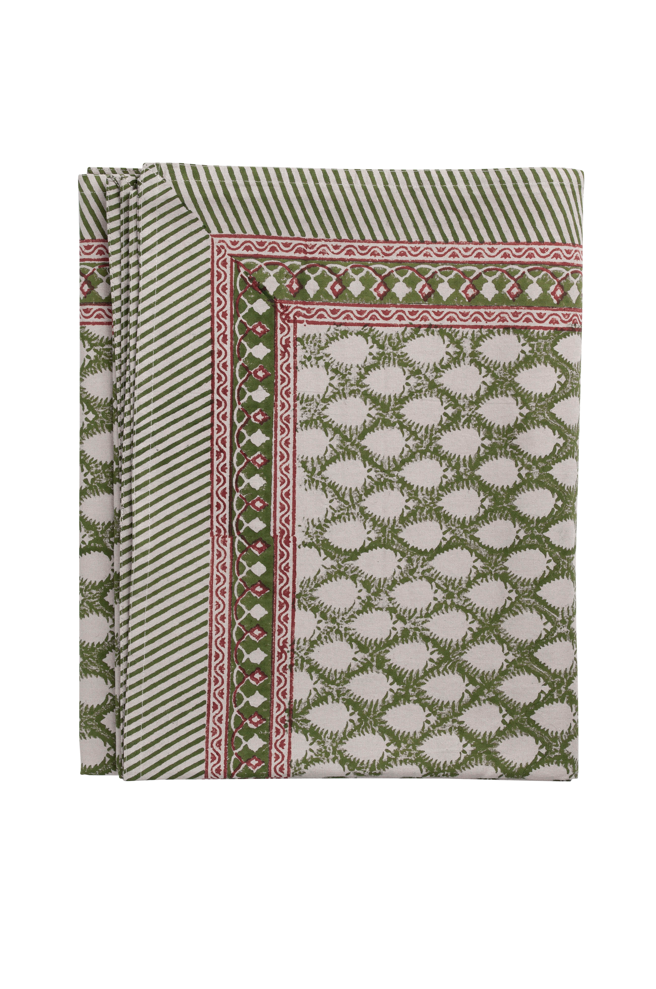 Vacker bordsduk i högkvalitativ bomull med ett elegant mönster och dekorativ kant. Mönstret är tryckt för hand med hjälp av traditionella indiska blocktryckstekniker. Ett traditionellt hantverk som ger varje kuddfodral ett unikt och dekorativt uttryck. Detta kuddfodral levereras utan innerkudde. Tvätta med omsorg på ett kort (max 1 timme) och skonsamt program för ull/silke med milt tvättmedel.