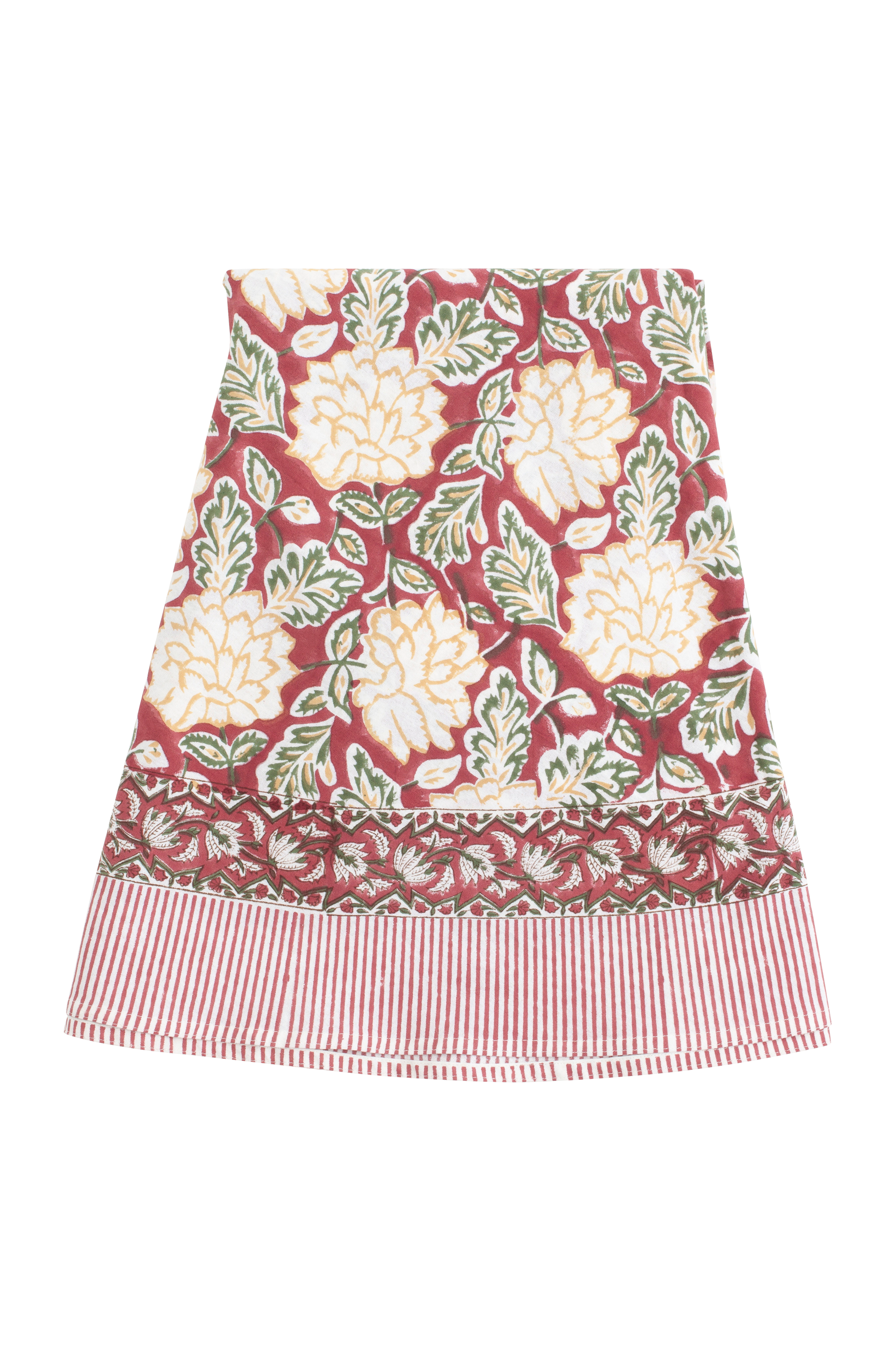 En vacker rund bordsduk med ett dekorativt blommönster och en prydnadsrand, tillverkad av Gots certifierad ekologisk bomull. Varje duk är omsorgsfullt handtryckt med hjälp av den urgamla träsnittstekniken, en beprövad teknik som ger djup, textur och själ till varje textil. Tvätta din handtryckta duk på ett kort (max 1 timme) och skonsamt program för ull/silke med milt tvättmedel. Stryk som bomull.