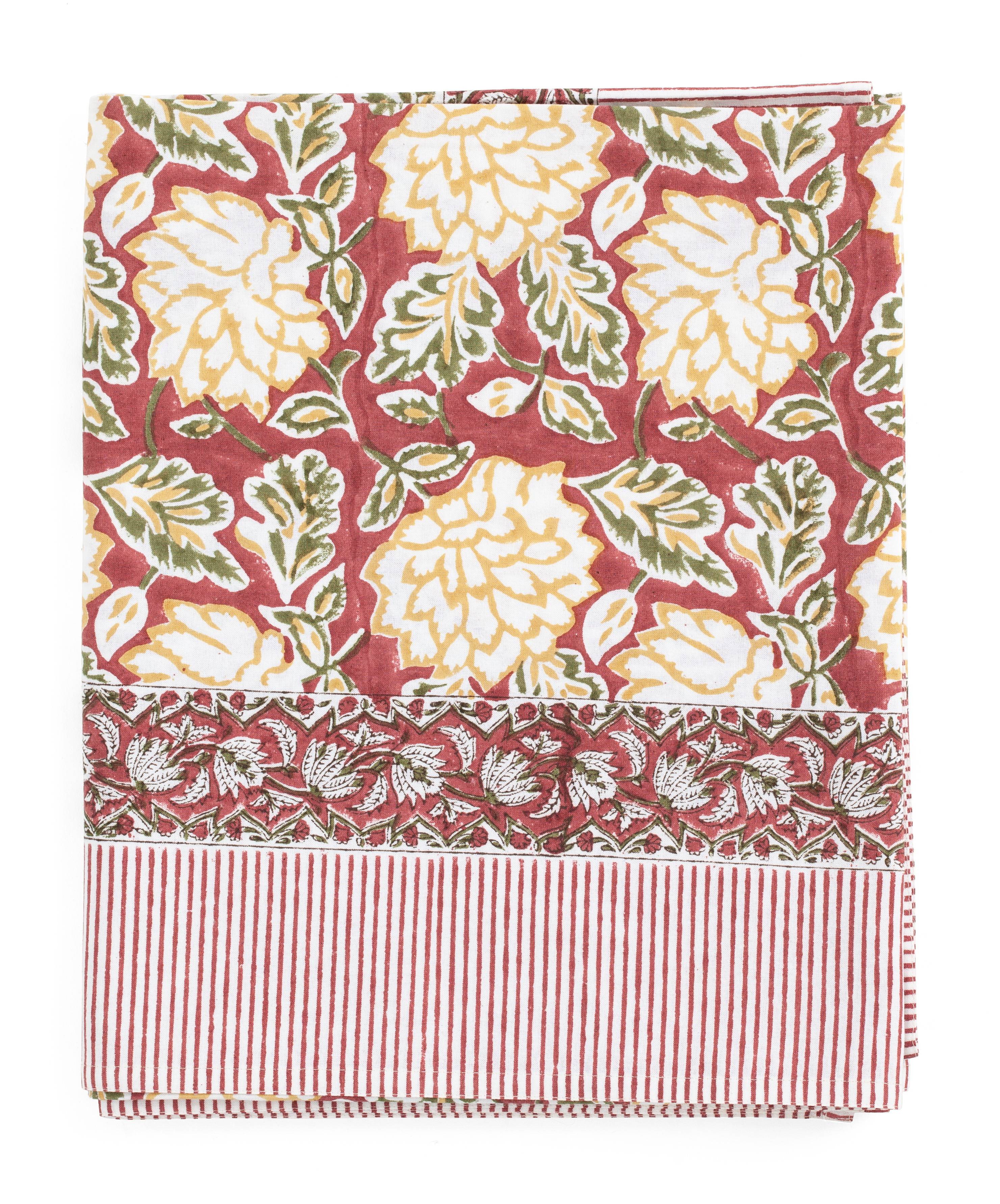 En vacker bordsduk med ett dekorativt blommönster och en prydnadsrand, tillverkad av Gots certifierad ekologisk bomull. Varje duk är omsorgsfullt handtryckt med den urgamla träsnittstekniken, en beprövad teknik som ger djup, textur och själ till varje textil. Tvätta din handtryckta duk på ett kort (max 1 timme) och skonsamt program för ull/silke med milt tvättmedel. Stryk som bomull.