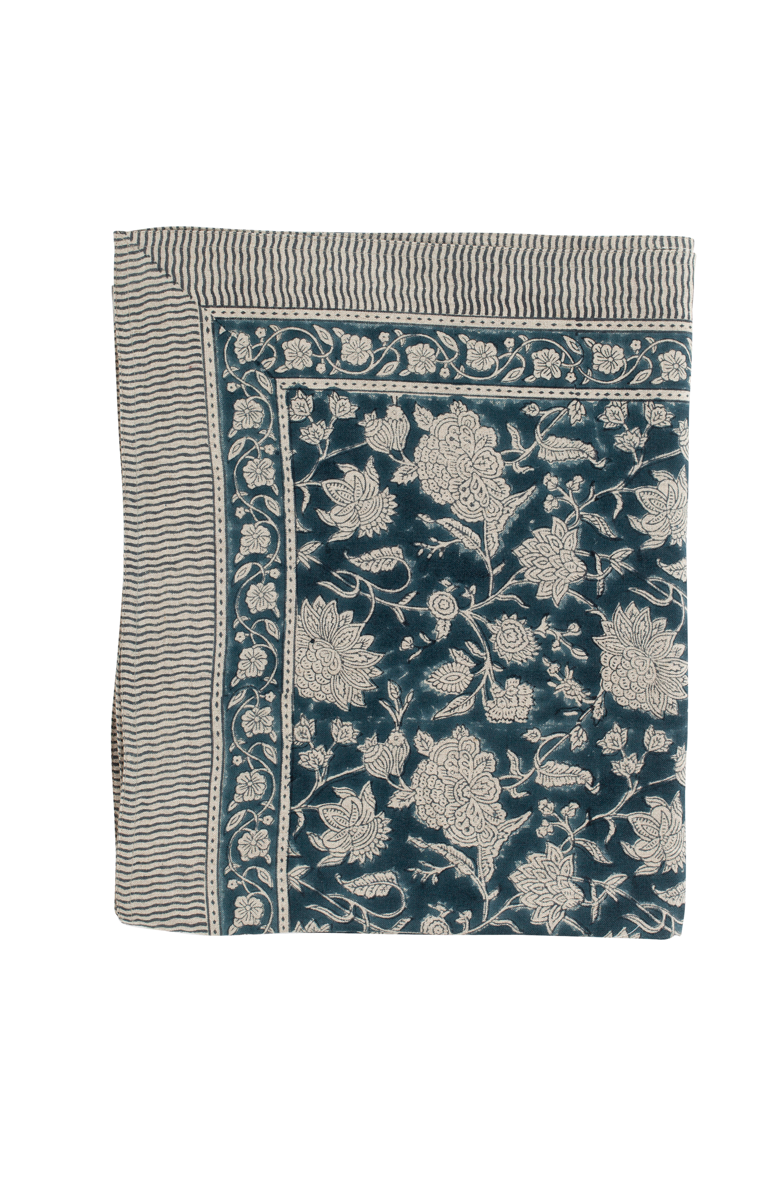 En exklusiv bordsduk i kraftigt linne med ett vackert blommönster och dekorativ bård. Mönstret är tryckt för hand med hjälp av traditionella trycktekniker från Indian. Ett unikt hantverk som ger varje duk ett unikt och dekorativt uttryck. Tvätta din duk på ett kort (max 1 timme) och skonsamt program för ull/silke med milt tvättmedel.