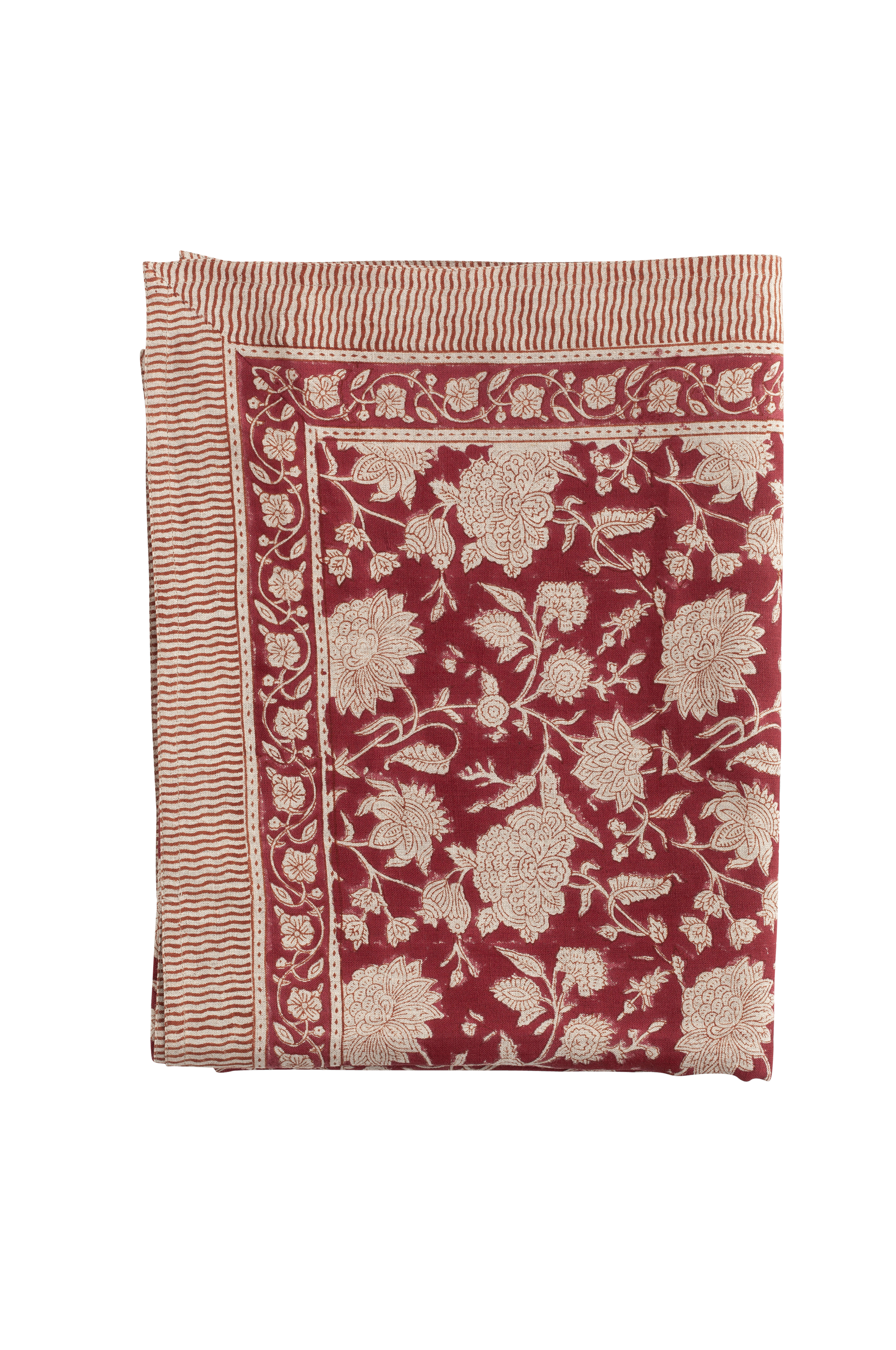 En exklusiv bordsduk i kraftigt linne med ett vackert blommönster och dekorativ bård. Mönstret är tryckt för hand med hjälp av traditionella trycktekniker från Indian. Ett unikt hantverk som ger varje duk ett unikt och dekorativt uttryck. Tvätta din duk på ett kort (max 1 timme) och skonsamt program för ull/silke med milt tvättmedel.